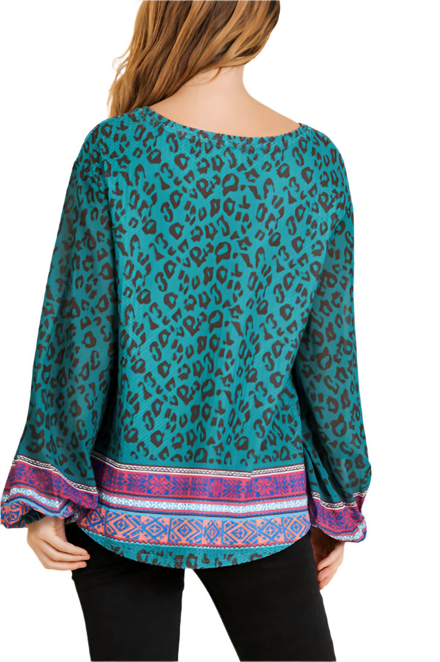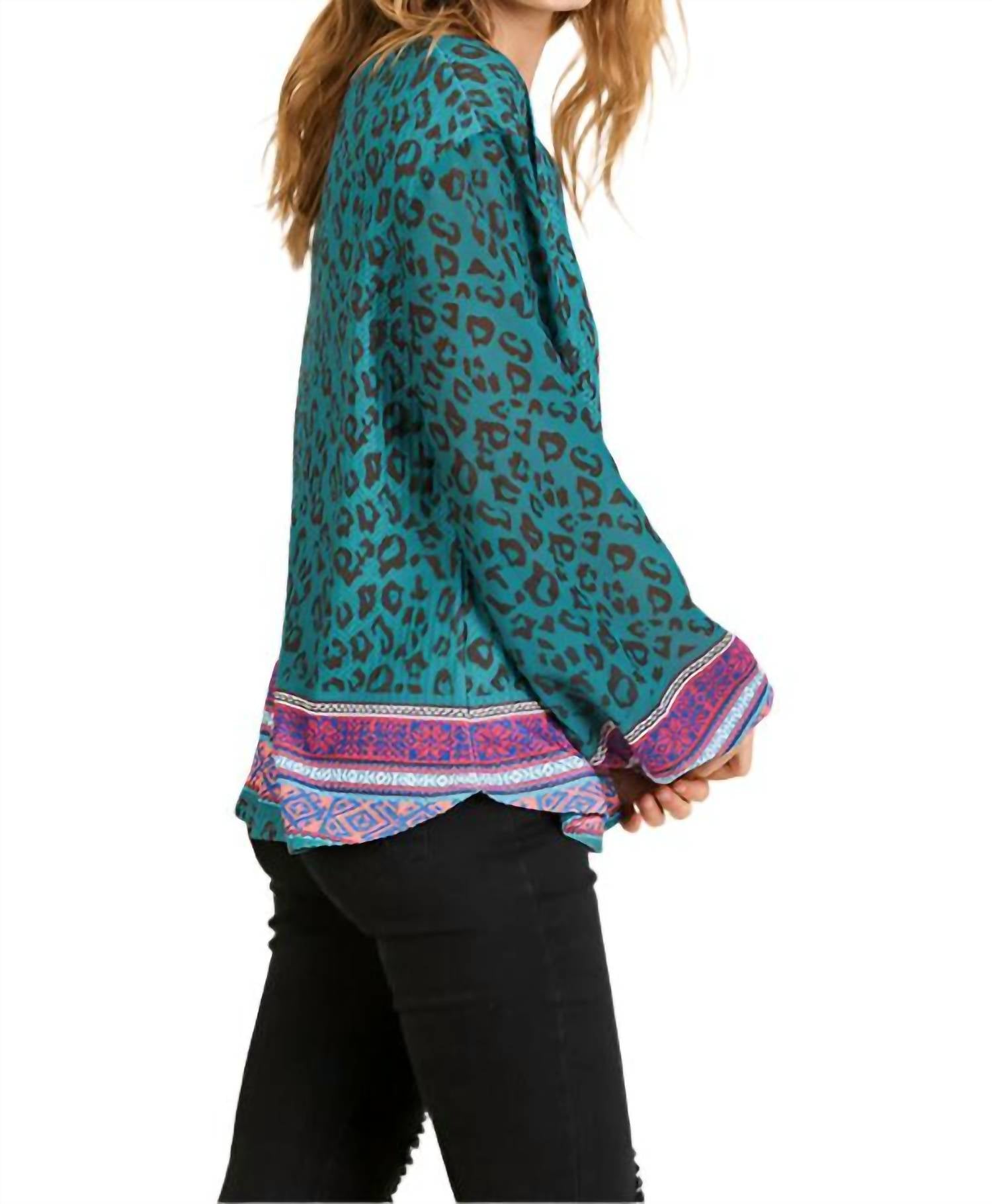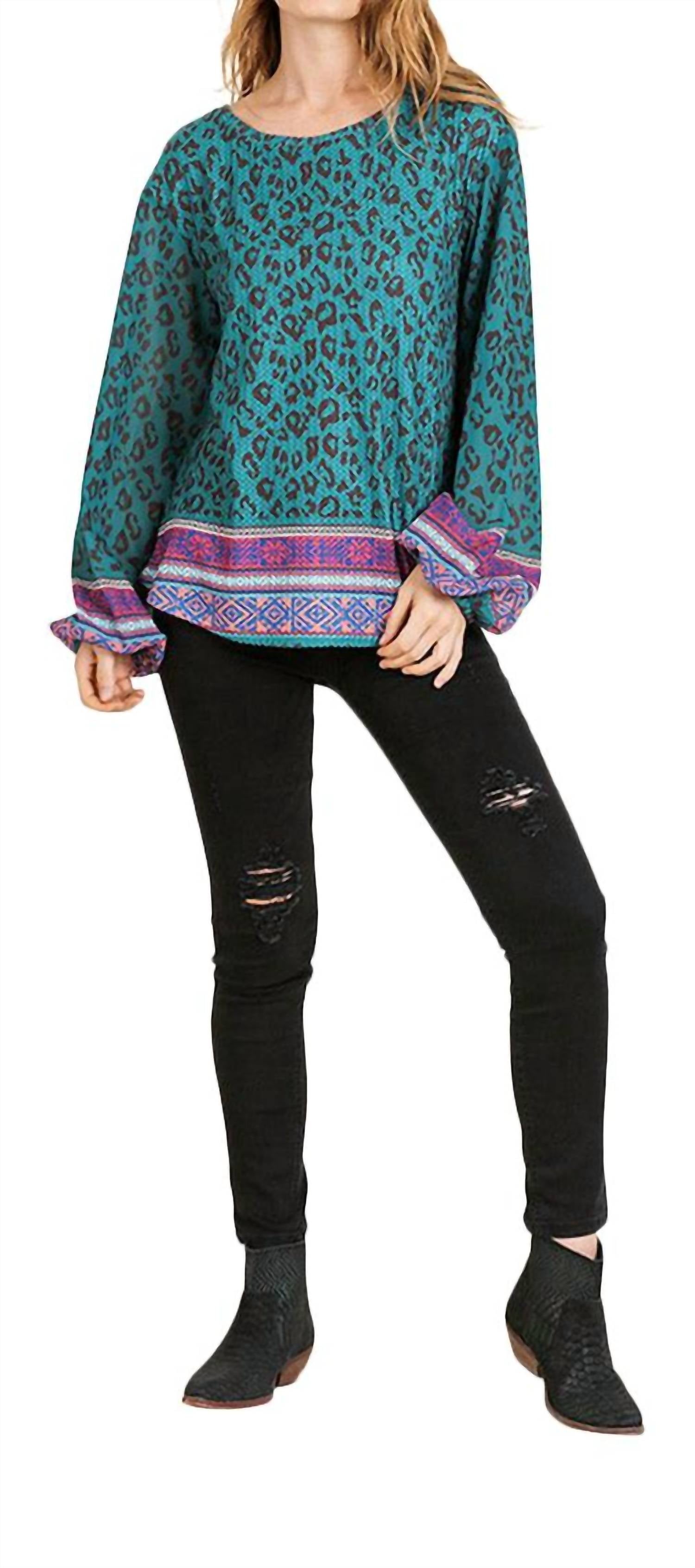 Представляем вязаный топ с принтом шарфа от Umgee, стильное дополнение к вашему гардеробу в стиле бохо в шикарном бирюзовом цвете. Этот топ имеет длинные полупрозрачные рукава-фонарики и овальный вырез, изготовлен из смеси 65% хлопка и 35% полиэстера с рукавами, полностью выполненными из полиэстера. Изготовлен из импортного легкого вафельного трикотажа с шарфом и леопардовым принтом, имеет застежку-липучку для дополнительного удобства. Уход - Ручная стирка в холодной воде для сохранения яркого дизайна.