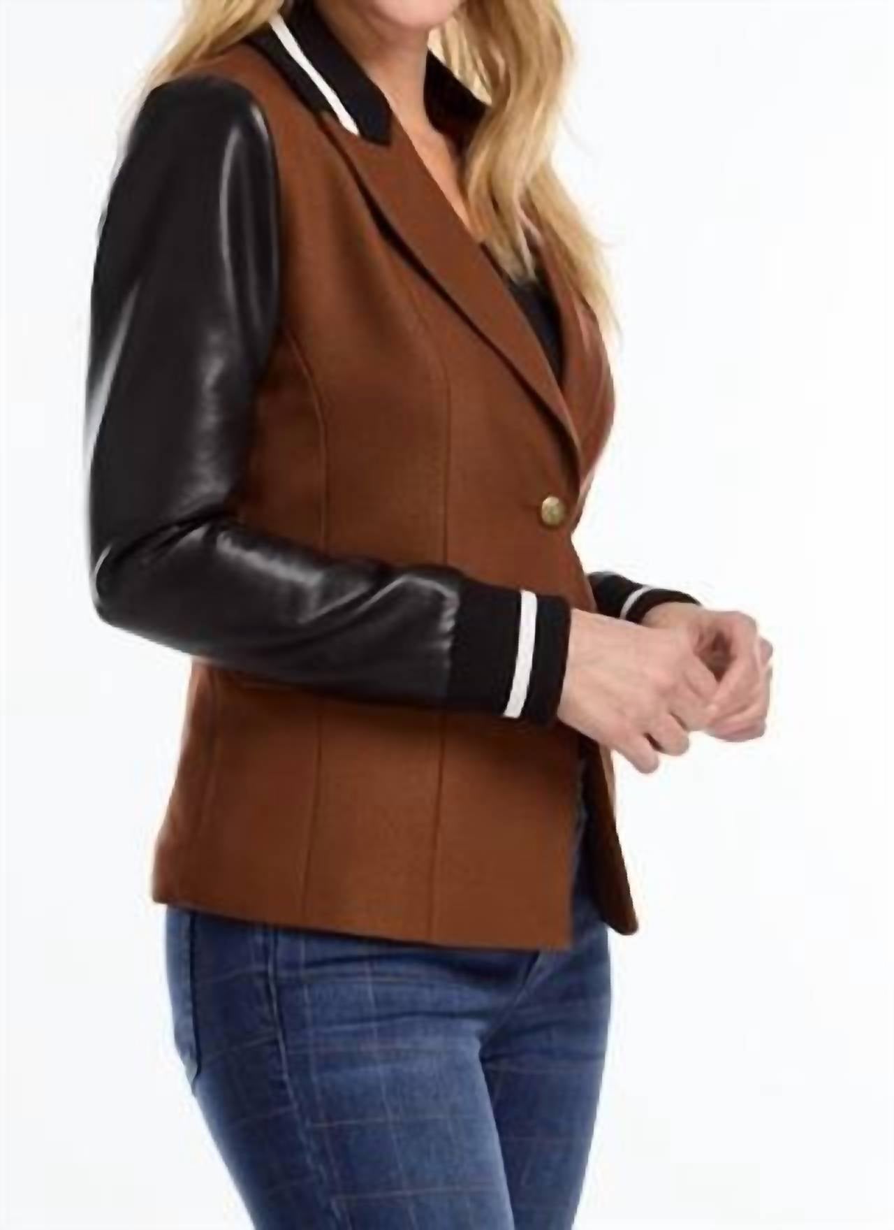 Смелая модель цвета эспрессо. Сочетает в себе тепло куртки и стиль блейзера. Длинные контрастные рукава из искусственной кожи, дополненные манжетами из ребристого материала и воротником. Искусно изготовлено из 66% полиэстера, 28% вискозы и 6% эластана. Удобная посадка, традиционная застежка на пуговицы и карманы с клапанами спереди. Инструкции по уходу включают ручную стирку в холодной воде, избегание отбеливателя, сушку в подвешенном состоянии и химчистку по желанию.