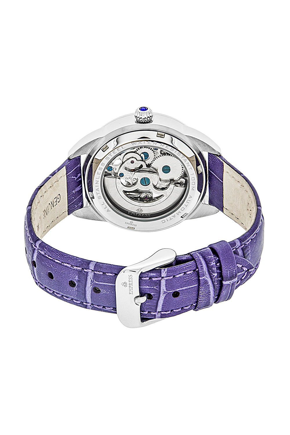 Часы Empress Godiva обладают следующими характеристиками: корпус из нержавеющей стали хирургического качества 316l, автоматический механизм с драгоценными камнями, подшипники на драгоценных камнях - 19 камней, запас хода 36 часов, частота колебаний в час (пк/ч) - 21600/час, минеральное стекло с сапфировым покрытием, перламутровый циферблат, скелетонизированный циферблат, 12 кристаллических маркеров на циферблате, смотровая задняя крышка для наблюдения за механизмом, заводная головка с драгоценными камнями, ремешок из натуральной кожи с тиснением под крокодила, застежка из нержавеющей стали с выгравированным логотипом, светящиеся стрелки, диаметр 38 мм, водонепроницаемость 10 АТМ.