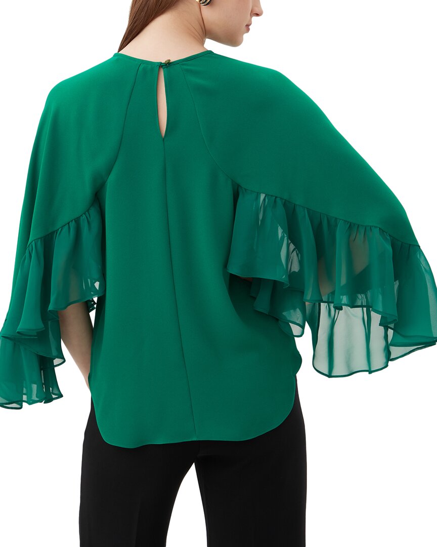 Представляем топ Trina Turk Akari, стильное дополнение к вашему гардеробу от известного бренда Trina Turk. Этот современный и красочный топ черпает вдохновение из многокультурного микса Калифорнии. Топ Akari изумрудного цвета имеет круглый вырез, открытые рукава длиной 3/4 с контрастной оборкой и круглый подол для шикарного образа. С вырезом-замочной скважиной сзади и застежкой на пуговицы и петли этот топ одновременно модный и функциональный. Изготовлен в США из 67% переработанного полиэстера и 33% полиэстера, этот топ можно чистить только в химчистке. Добавьте яркости и стиля в свой наряд с топом Trina Turk Akari.