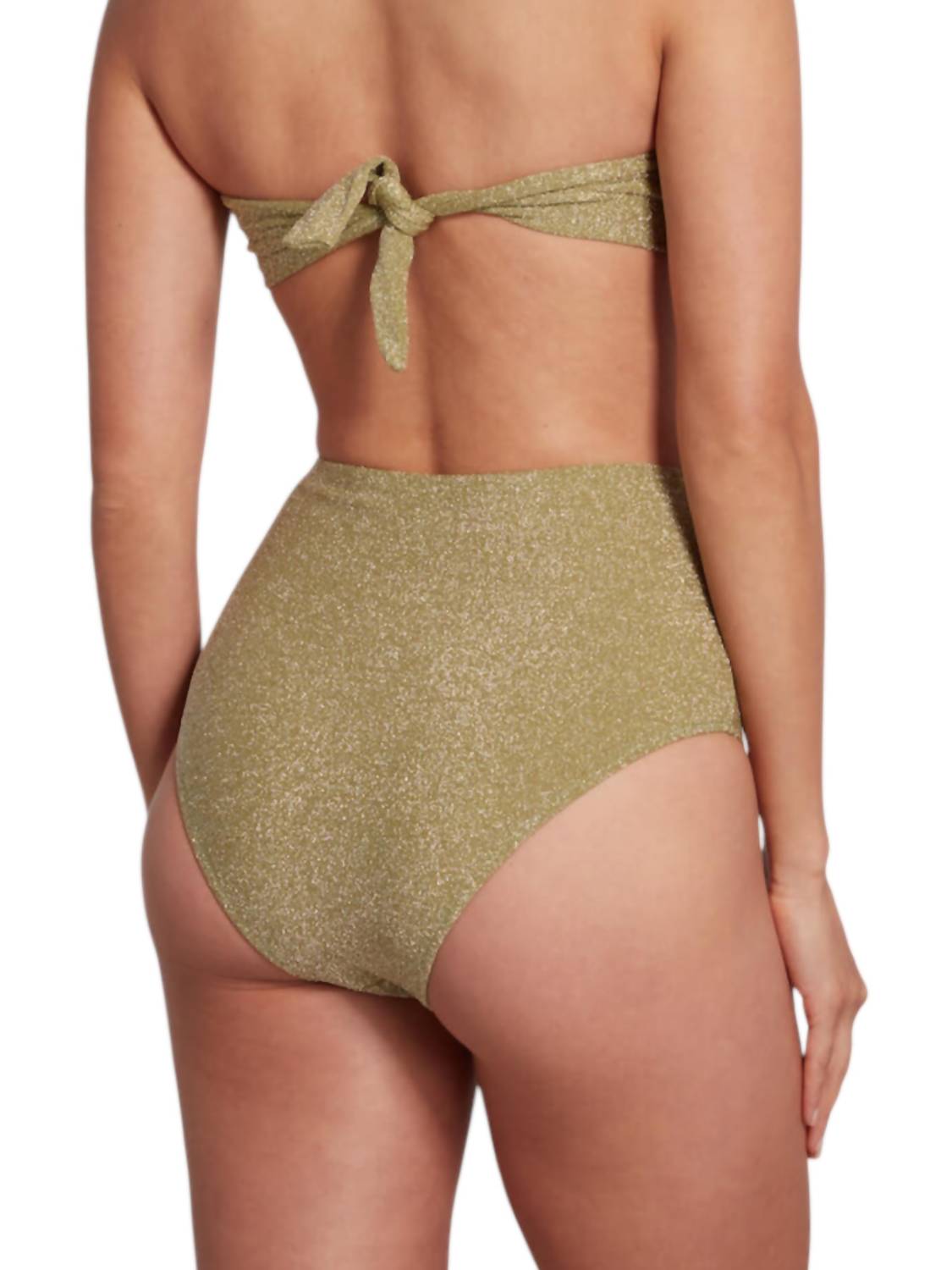 Модель имеет привлекательный дизайн с высокой талией и мерцающей отделкой, идеально подходящий для шикарного пляжного образа. Состав: 85% полиамида, 10% эластана и 5% металлизированного волокна; ручная стирка в холодной воде и сушка в горизонтальном положении.
