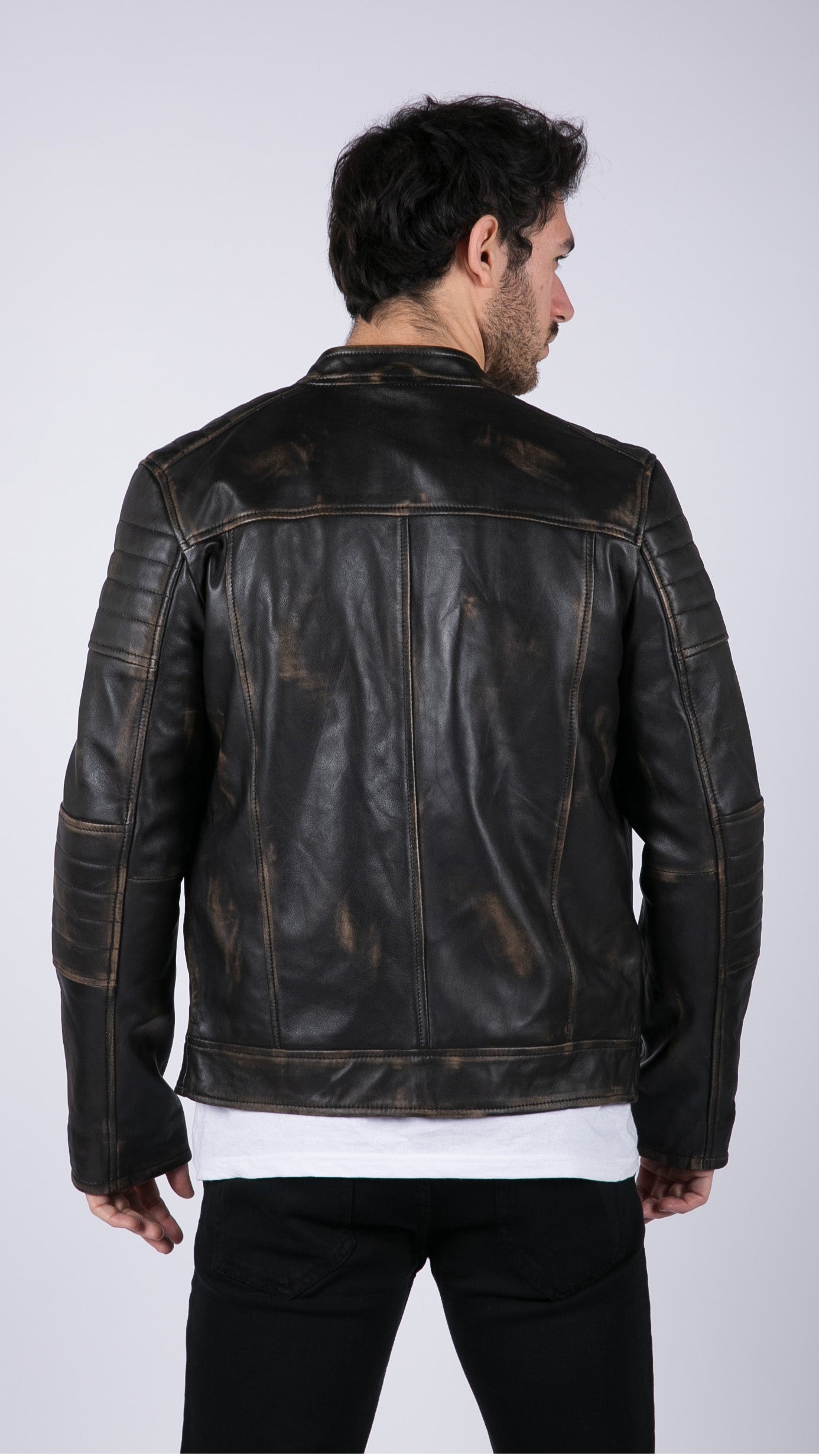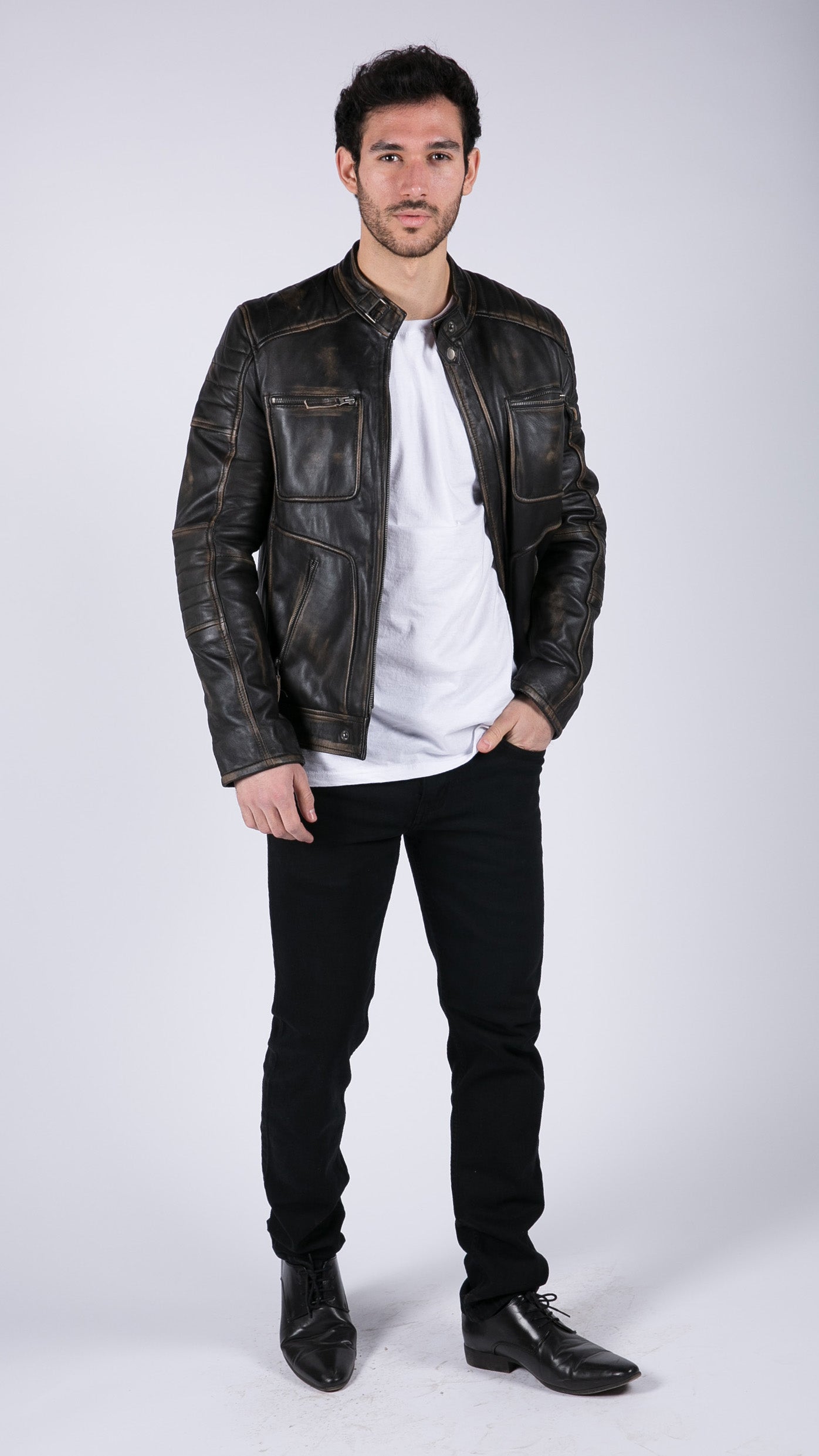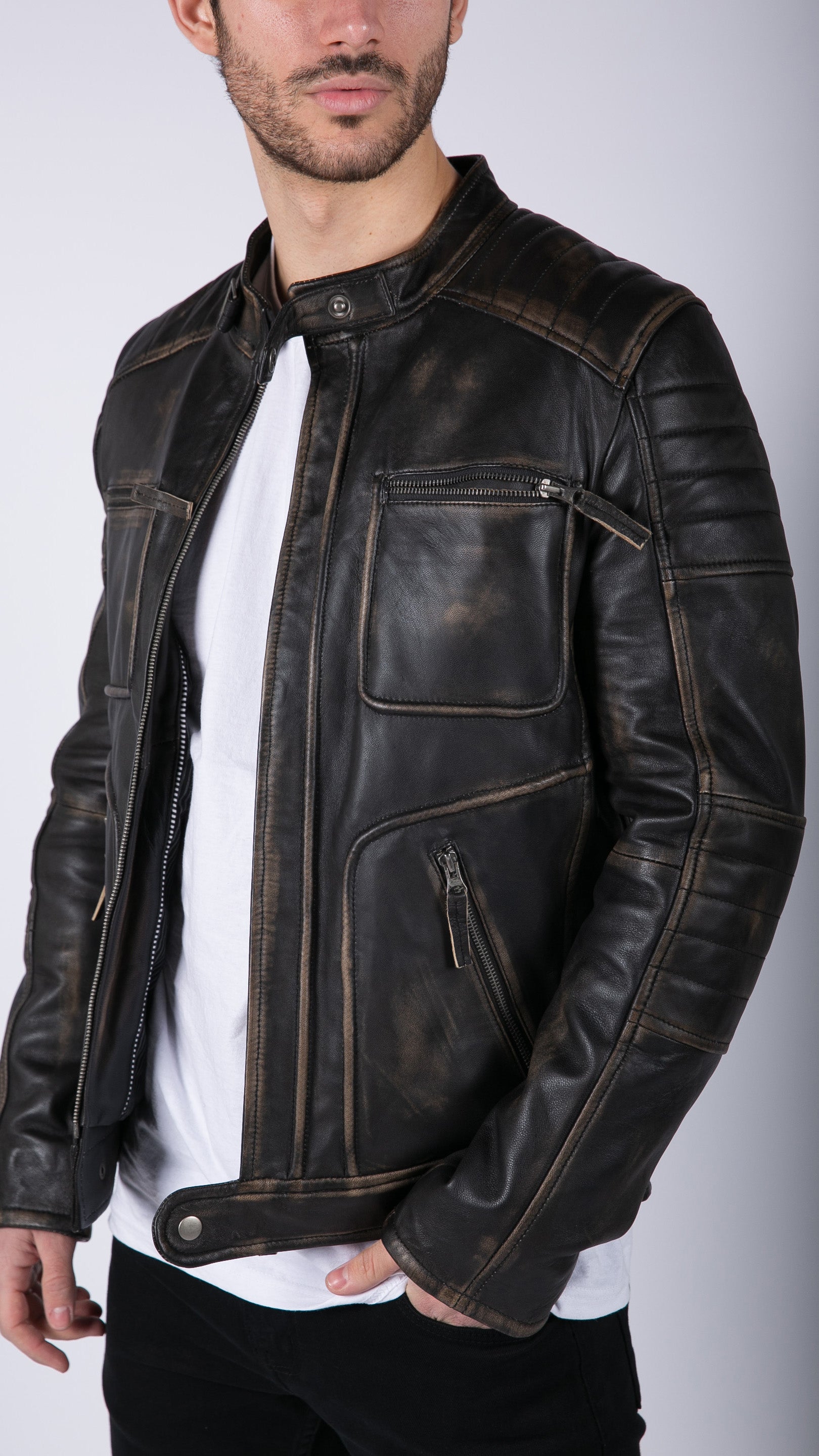 * Мужская байкерская куртка из натуральной кожи потрясающего черного коричневого цвета с потертой кожей * Дизайн с 4 карманами на молнии спереди, внутренними надежными карманами и строчкой на плечах * Повседневный дизайн с застежкой-молнией спереди * Воротник в стиле Неру с заклепками Материал - 100% кожа