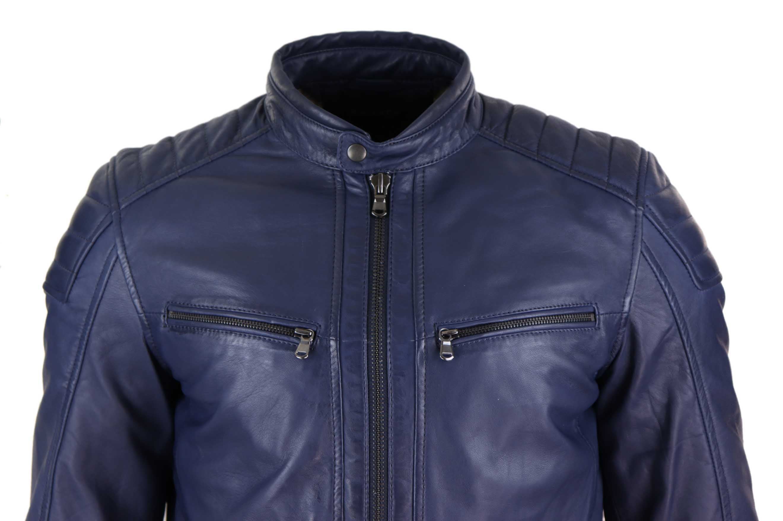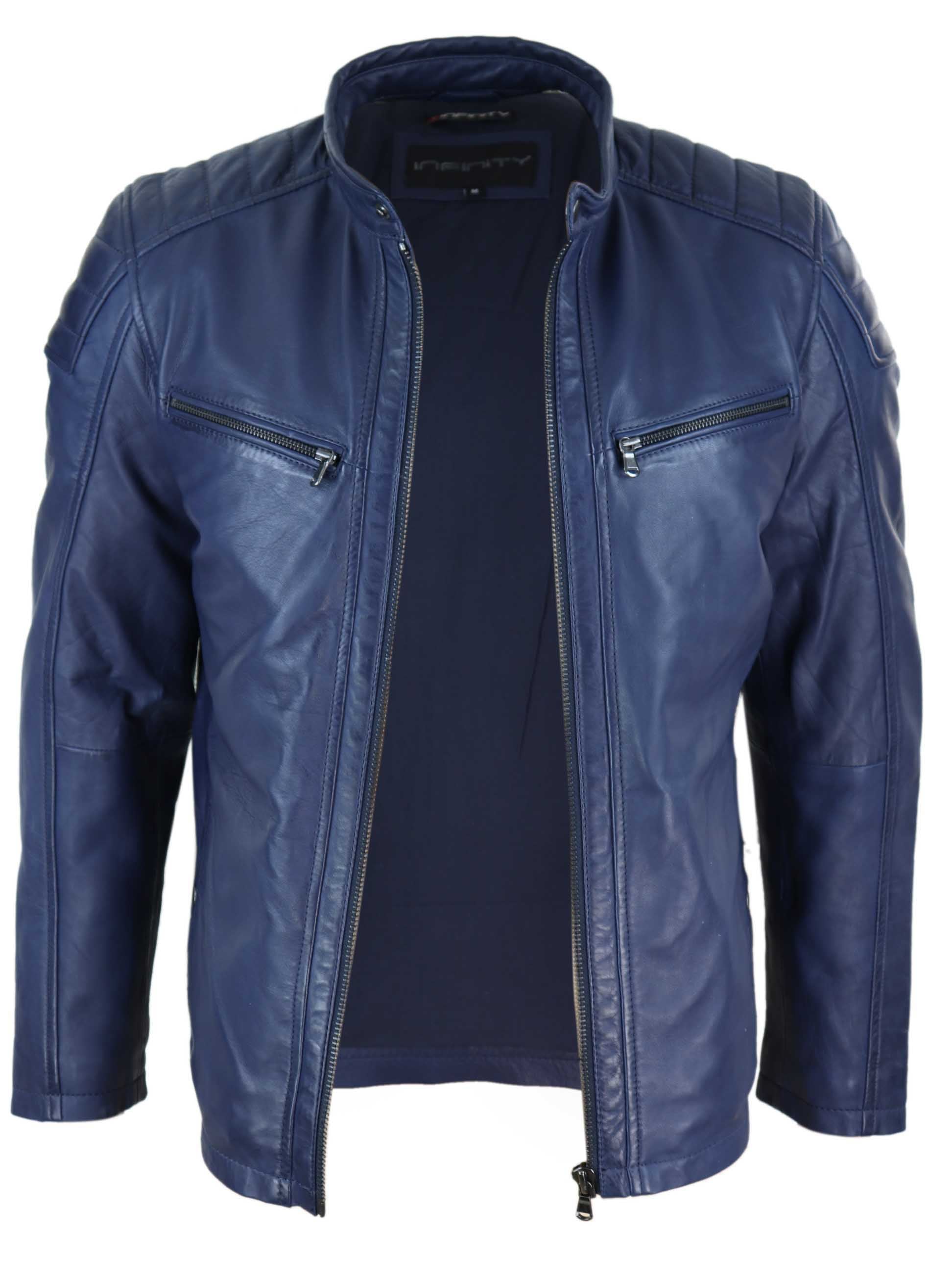 * Мужская куртка из натуральной кожи темно-синего цвета с коричневым отливом на молнии* Индивидуальный покрой (между облегающим и обычным), доступен в 2 потрясающих цветах!* Изготовлена ​​из мягкой кожи премиум-класса наппа* Боковые, нагрудные и внутренние карманы на молнииМатериал: снаружи — 100% кожа; подкладка — 100% полиэстер