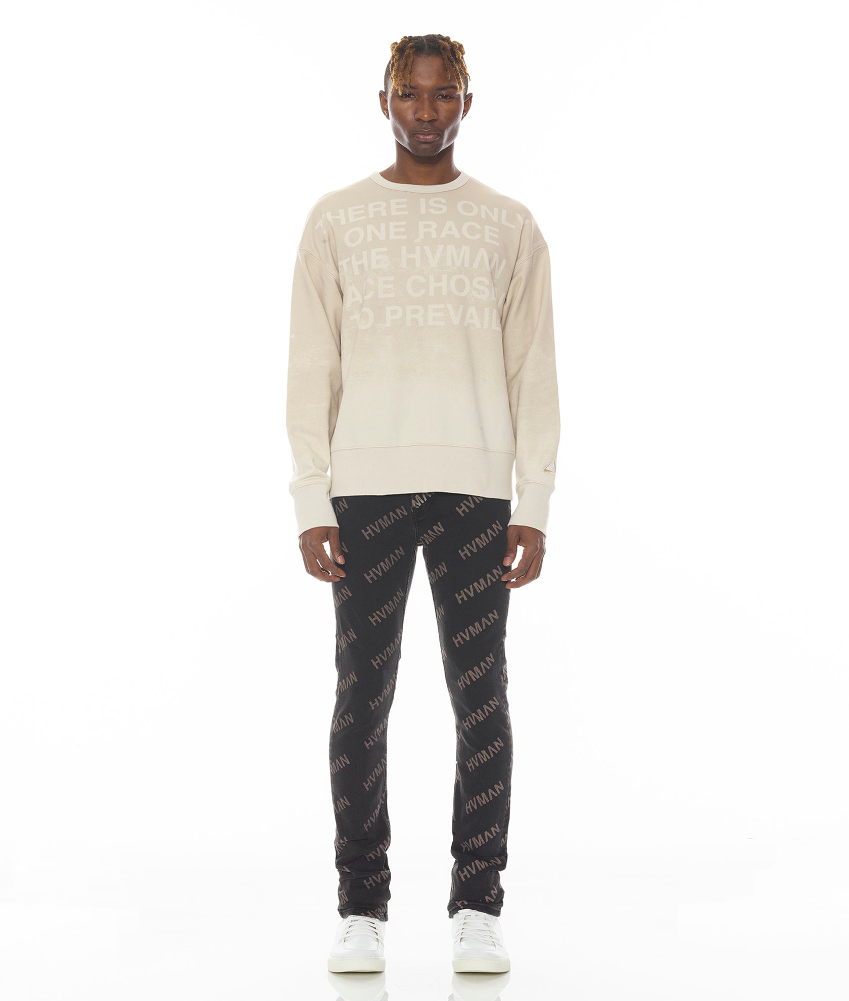 Этот кремовый пуловер с круглым вырезом — идеальный вариант для крутого, расслабленного образа. На этой толстовке спереди изображен цифровой принт нашей фирменной мантры.
