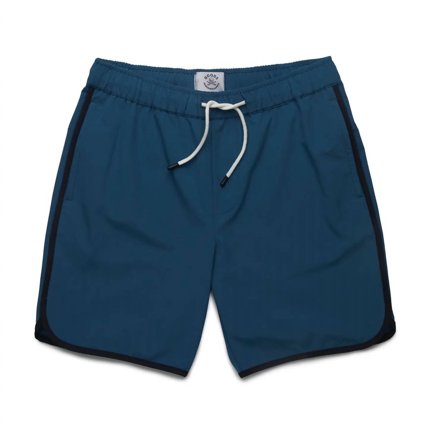 Goods Short сочетает в себе комфорт и ретро-стиль с легкой, эластичной тканью и кромкой дельфина. Длина внутреннего шва 7,25", контрастная отделка, два передних кармана в шве и два задних кармана — один на молнии. Эластичный регулируемый пояс обеспечивает надежную посадку.