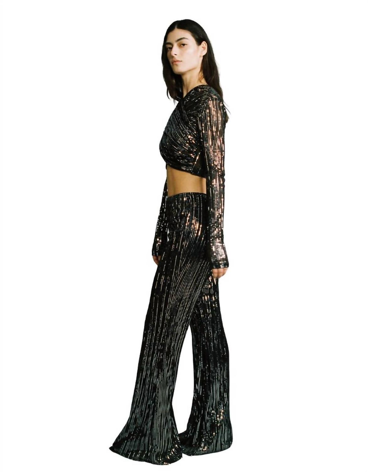 Высокая талия и широкий силуэт штанин, выполненные из роскошной ткани с люрексом, которая придает легкий блеск. Эти стильные брюки сочетают в себе комфорт и элегантность, идеально подходящие для любого наряда. 53% вискоза, 28% полиэстер, 19% люрекс.