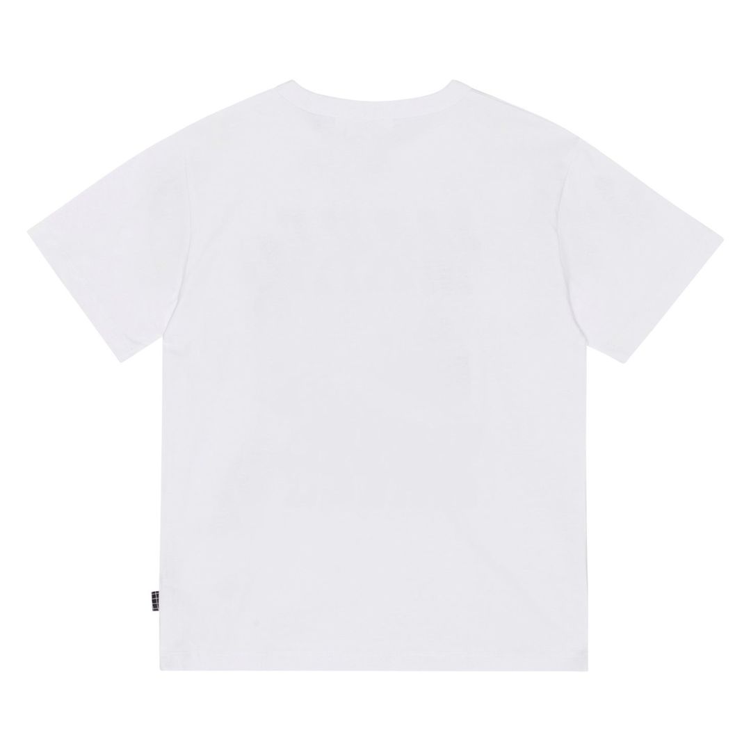 Белая футболка из 100% органического хлопка с принтом на передней стороне. На принте изображен остров с пальмами, видимый со стороны океана. На нем большие волны и слова «Make Waves». У Riley круглый вырез с ребристым краем и свободный крой.