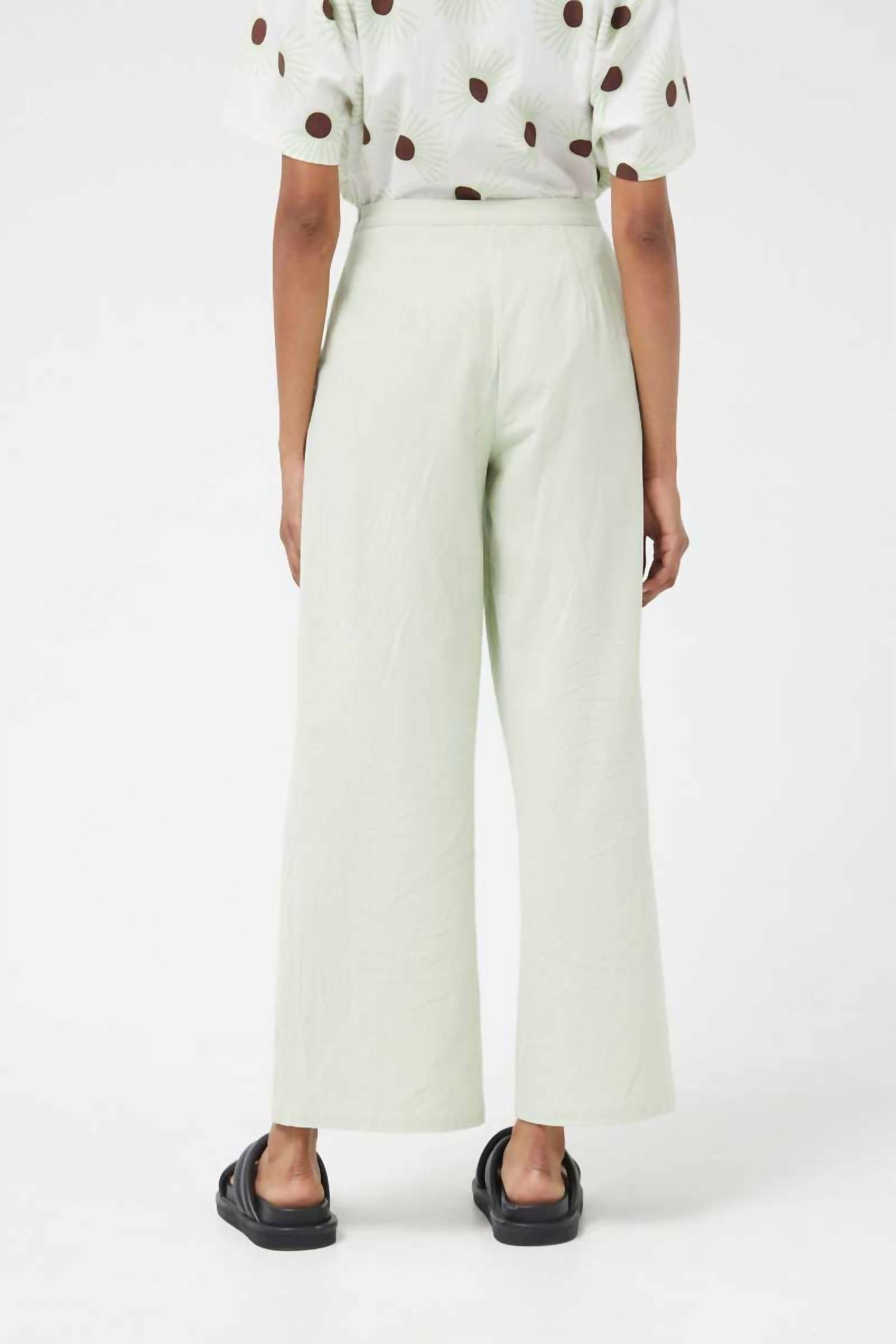 Длинные зеленые брюки. Фиксированная высокая талия и прямые штанины. Застежка-молния сбоку.