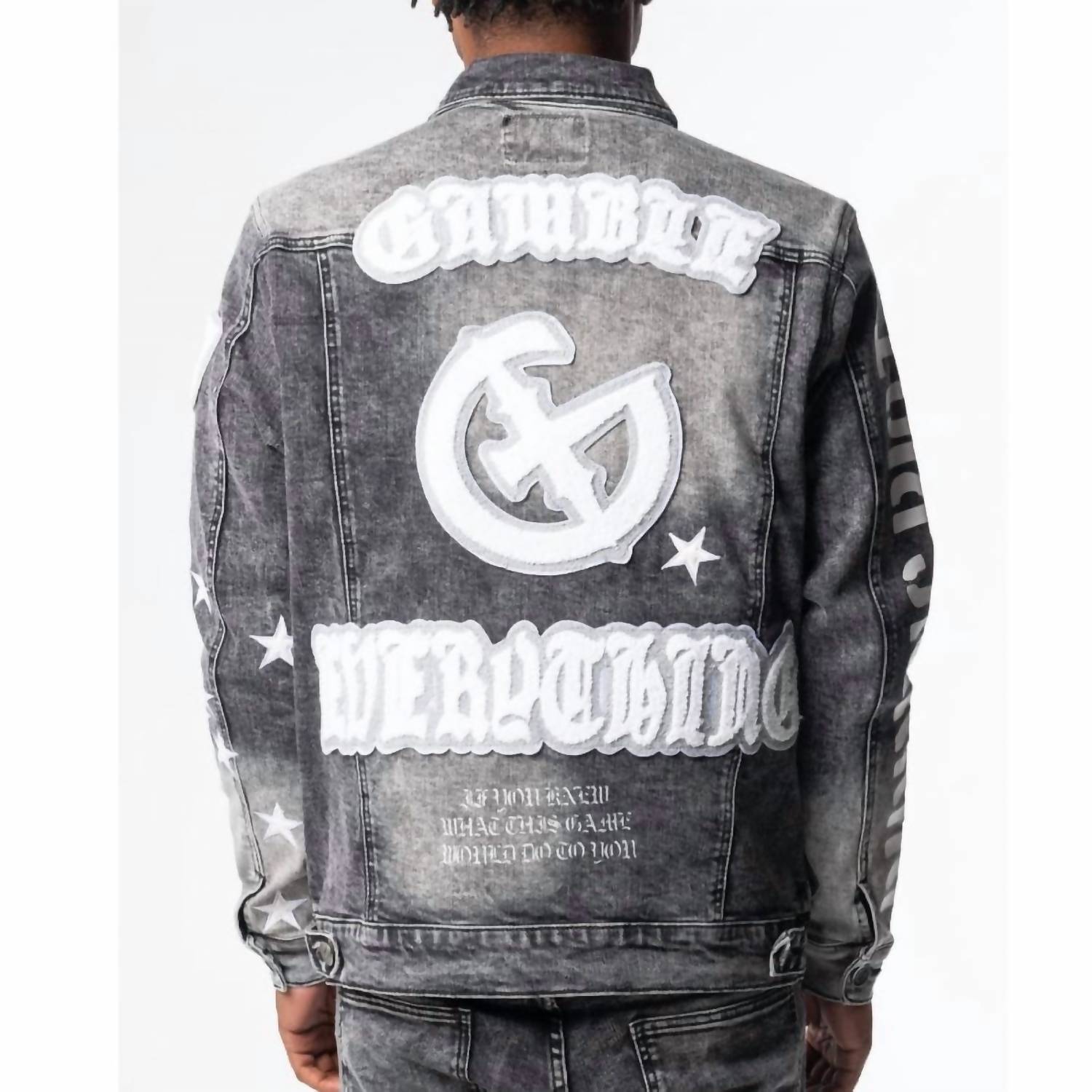 Классический силуэт джинсовой куртки с трафаретным типографским принтом. Полуночная стирка с сильными разрывами и потертостями по всей длине. Добавлена эластичность для комфорта. Модель ростом 6 футов 1 дюйм, весом 165 фунтов носит размер L.