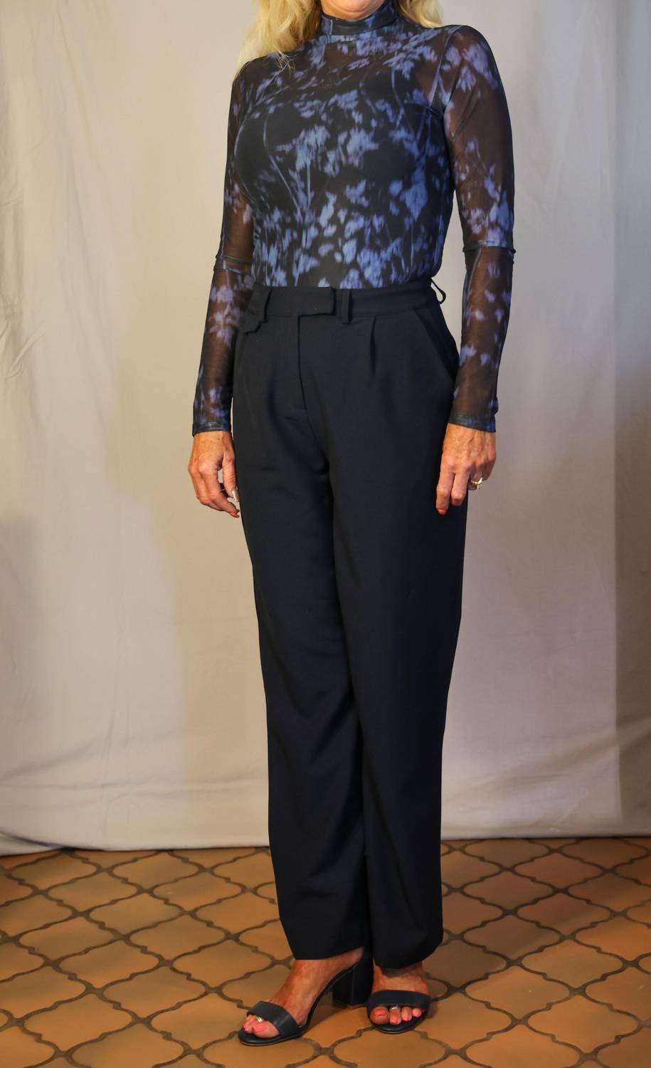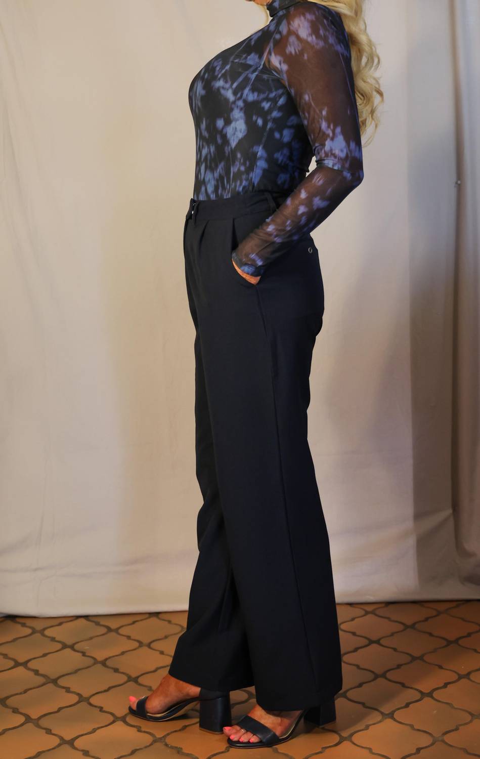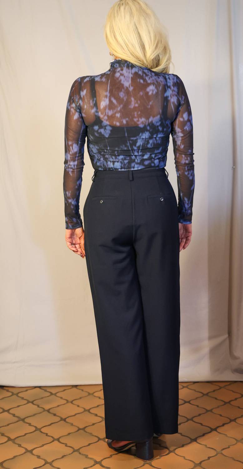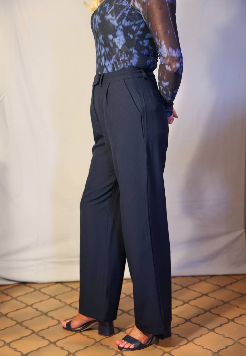 Брюки темно-синего цвета. С длинными штанинами. Застежка на молнию и пуговицы. Плиссированная отделка спереди. 75% полиэстер, 20% вискоза, 5% эластан. Сделано в Мадриде
