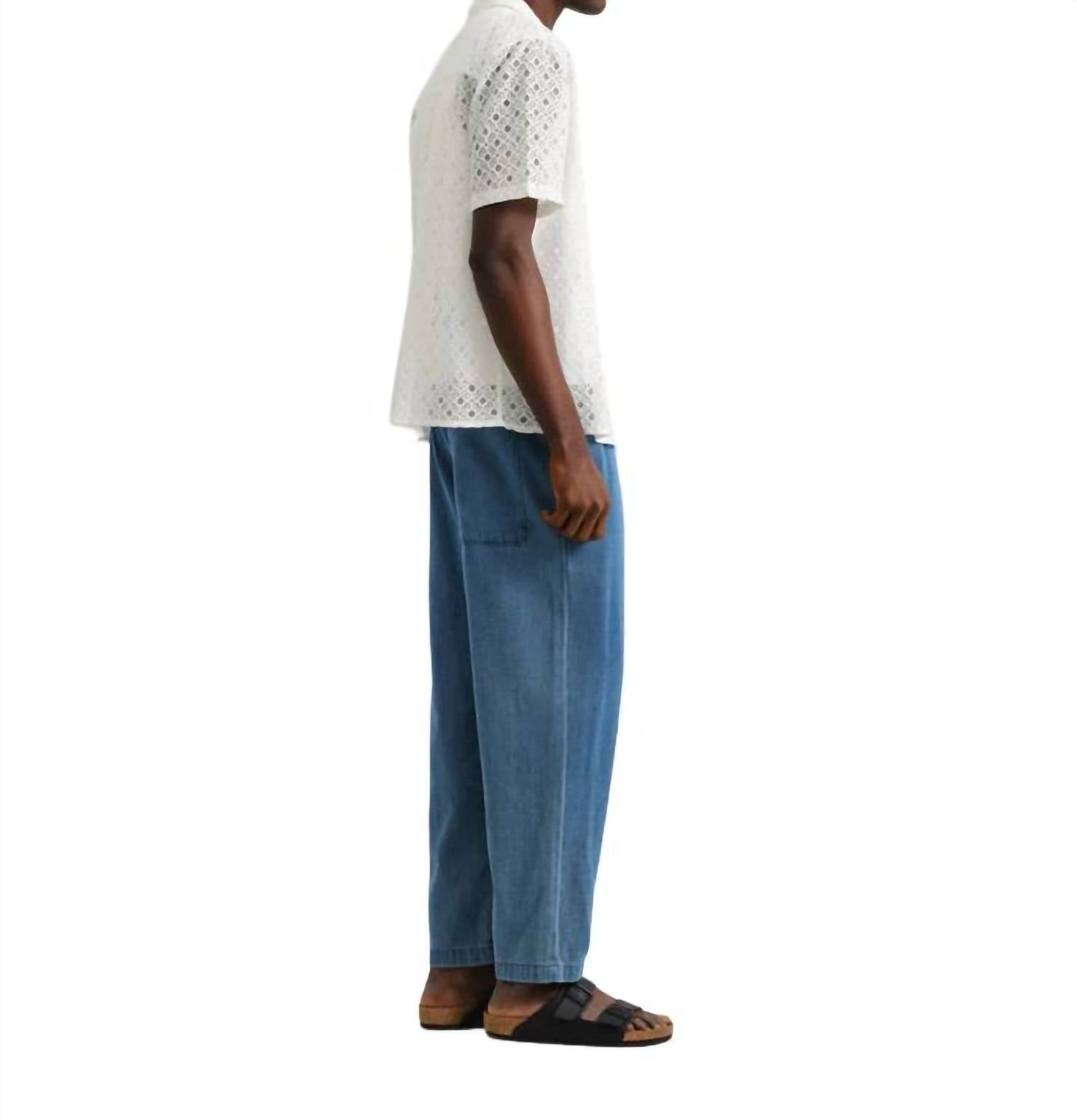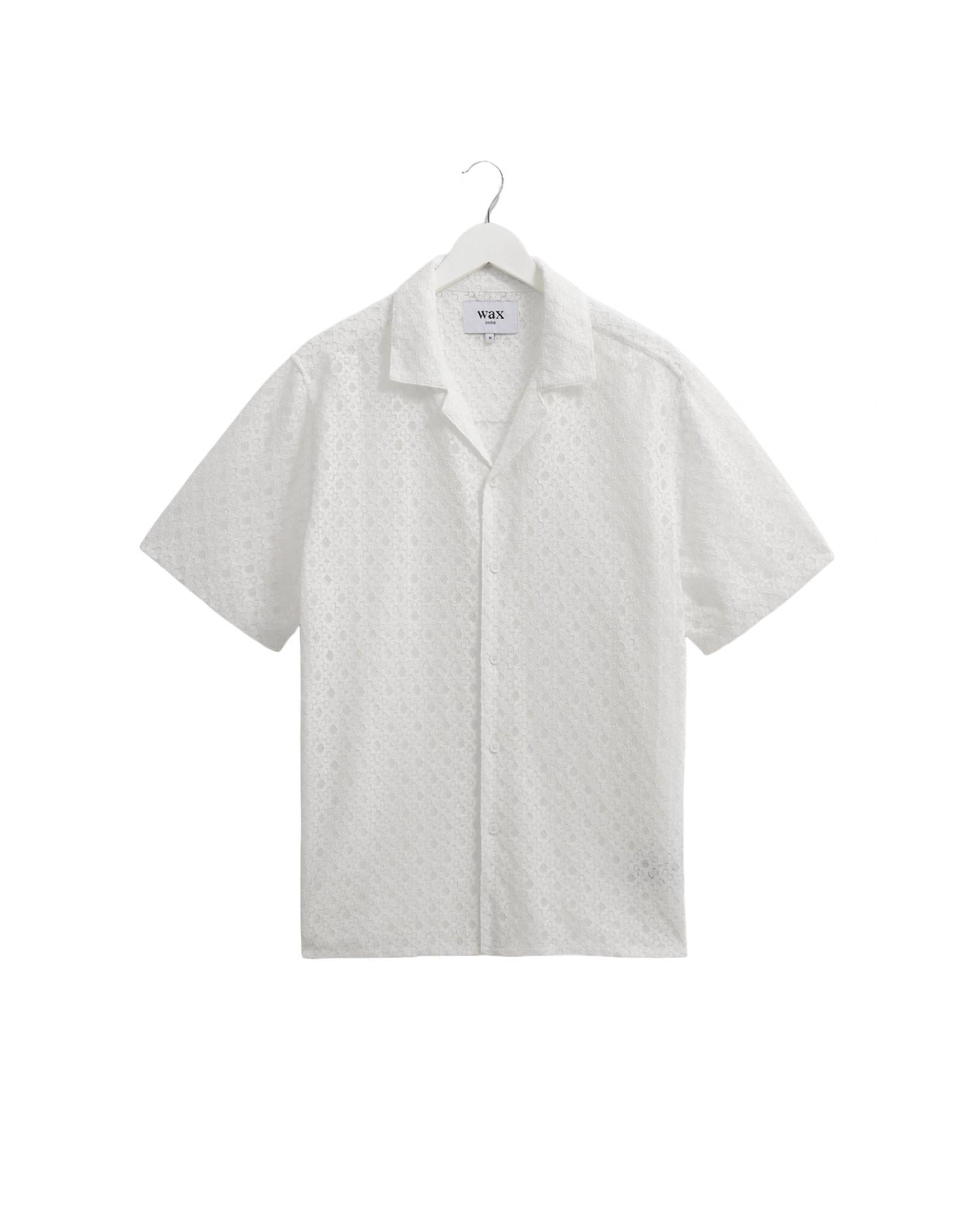 Рубашка с короткими рукавами выполнена из шнурованного кружева, имеет свободный крой, воротник-стойку и прямой подол. Изготовлена из 60% хлопка и 40% нейлона, ее можно стирать в стиральной машине при температуре 30 градусов по Цельсию. Модель носит размер M, ее рост 6 футов. Сделано в Китае.