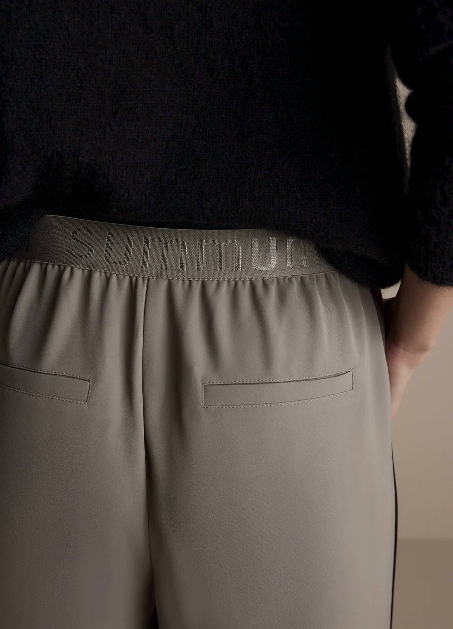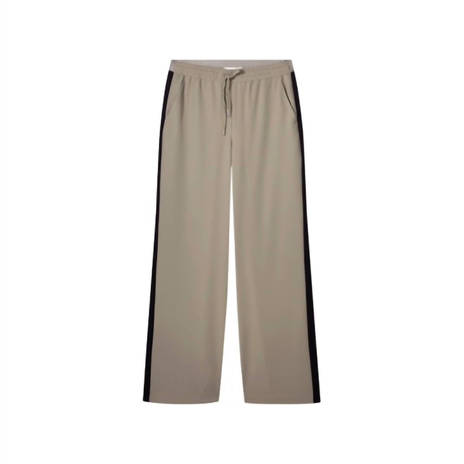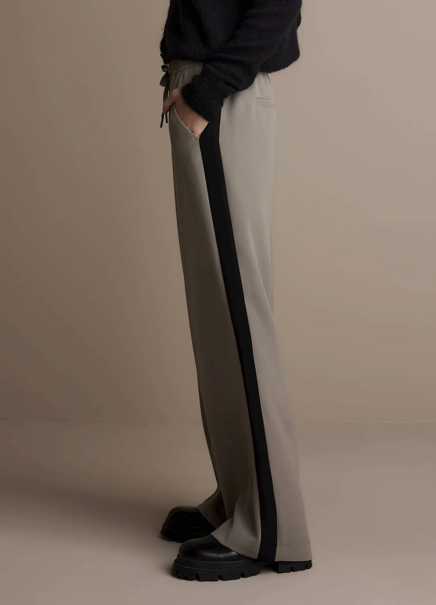 Свободные широкие брюки с эластичным поясом и застежкой на шнурок. Мягкая ткань имеет контрастную планку по боковому шву и прорезные карманы на прямых широких штанинах. 100% полиэстер. Машинная стирка, деликатный режим в прохладной воде, сушить на веревке.