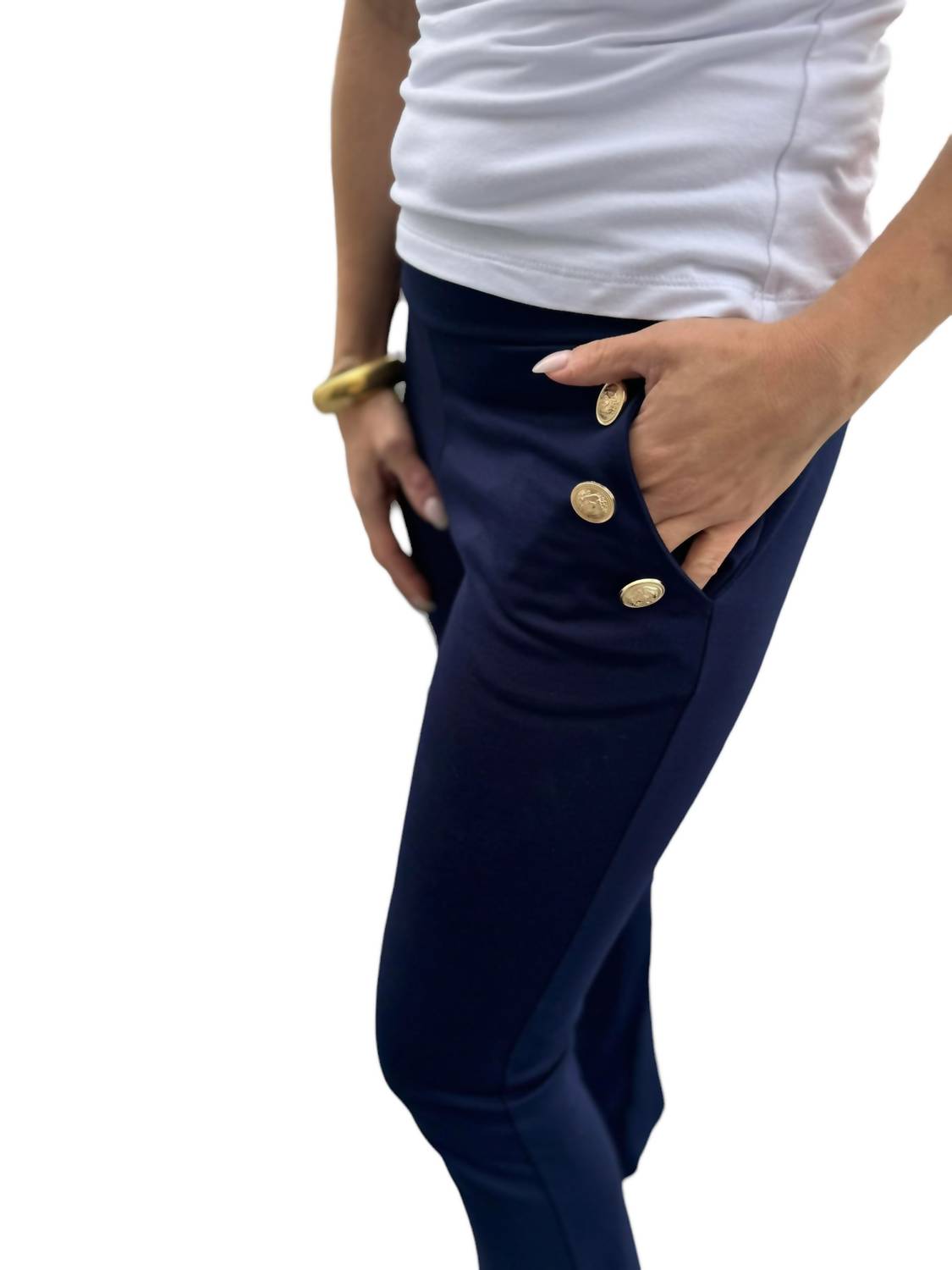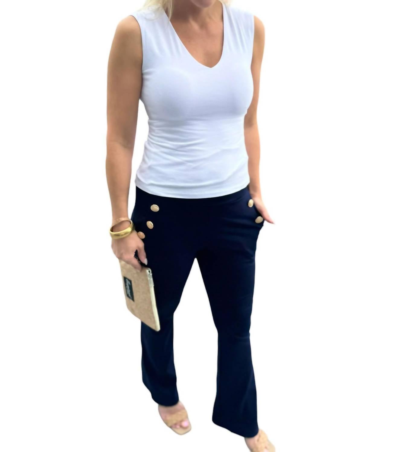Эти брюки Ponte с затягивающейся талией, карманами, золотыми пуговицами и расклешенным подолом по всей длине. Сочетайте их с нашей майкой Mom Tank. и золотыми кольцами для создания элегантного делового образа. 68% вискозы, 27% нейлона, 5% спандекса.