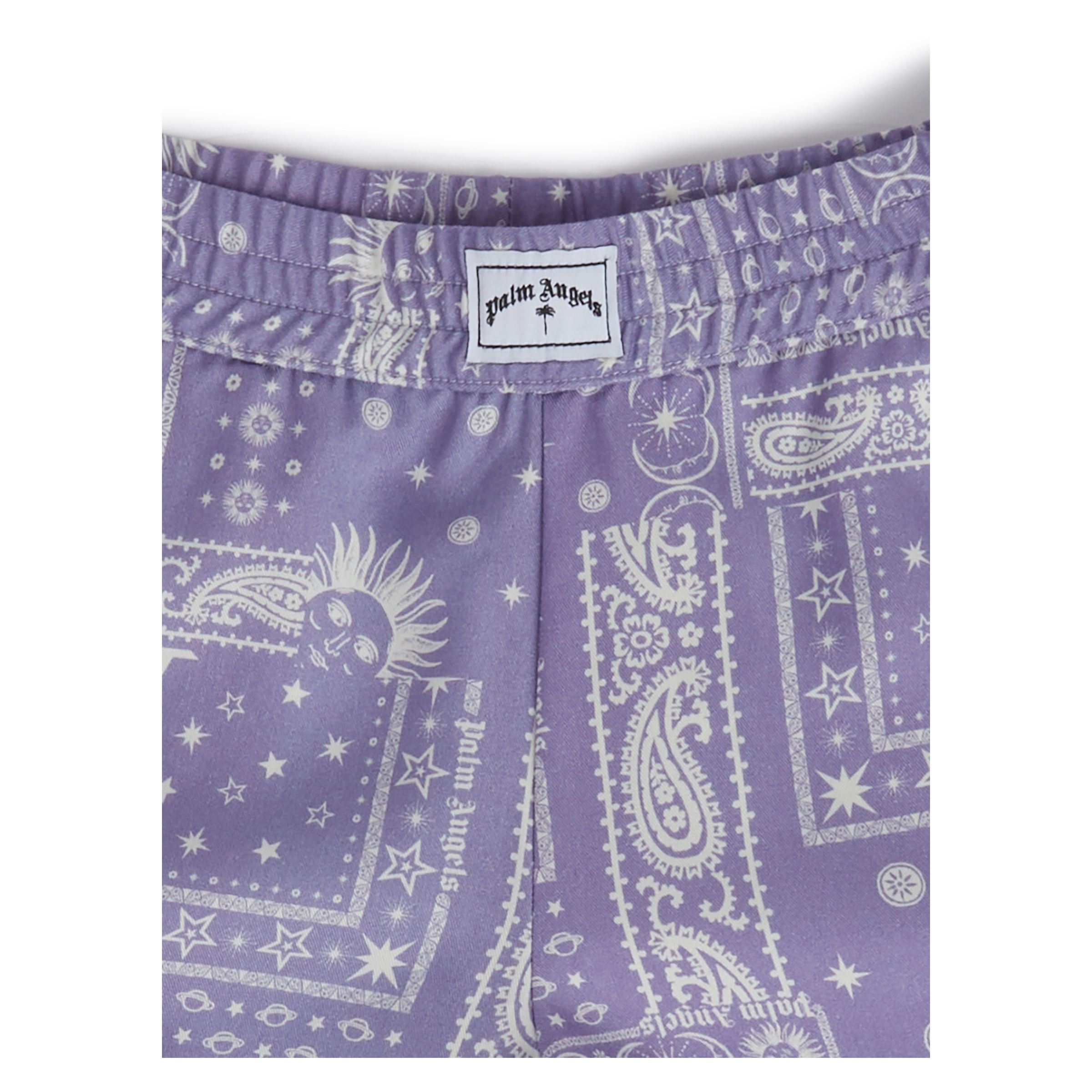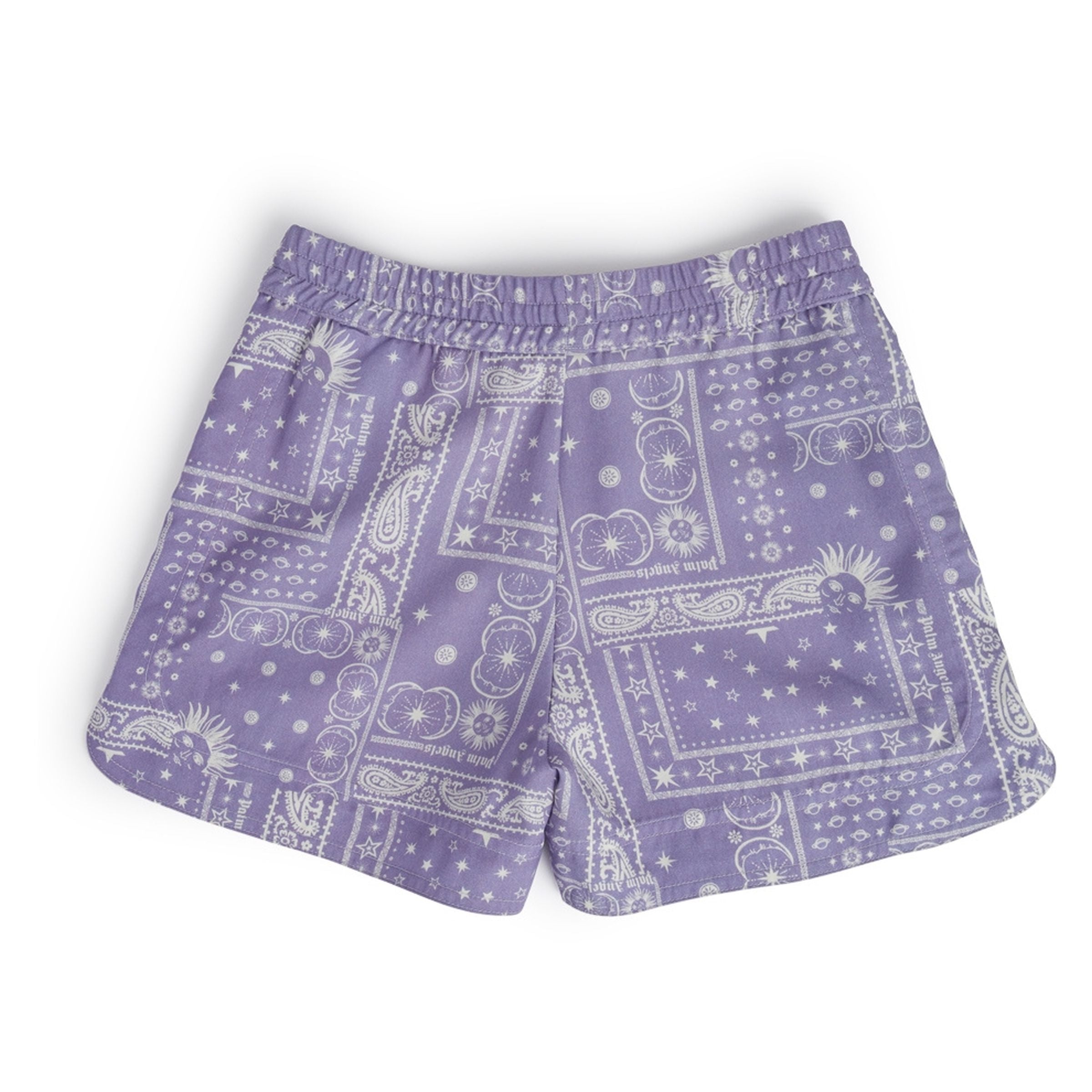 Сиреневый, фиолетовый и белый графический принт по всей поверхности, декоративная строчка, нашивка с логотипом спереди, два боковых врезных кармана, короткие боковые разрезы, эластичный пояс.