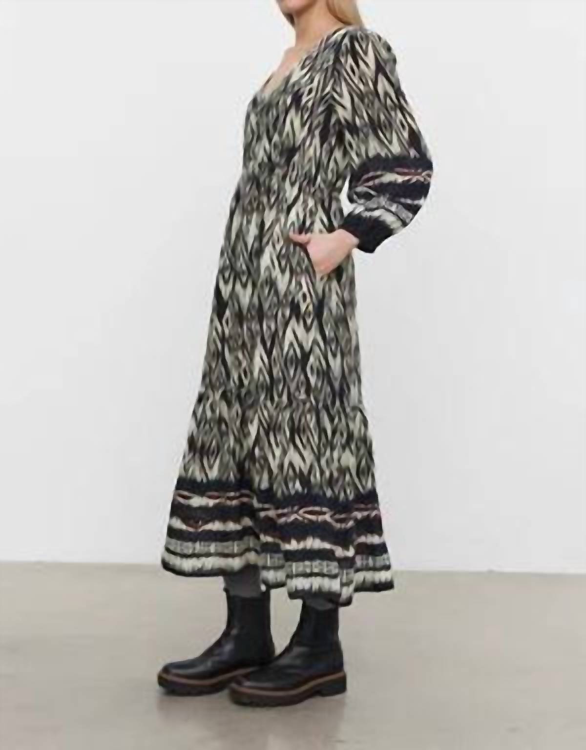 Потрясающее платье миди в ярком черном/экрю цвете с пленительным принтом икат. Это платье с длинными рукавами изготовлено из 100% мягкой вискозы, имеет двухслойный дизайн с привлекательным V-образным вырезом и планкой на 3 пуговицы. Сделано в Индии, обещает элегантность и практичность с боковыми швами карманов и эластичными манжетами. Химчистка и сушка в разложенном виде.