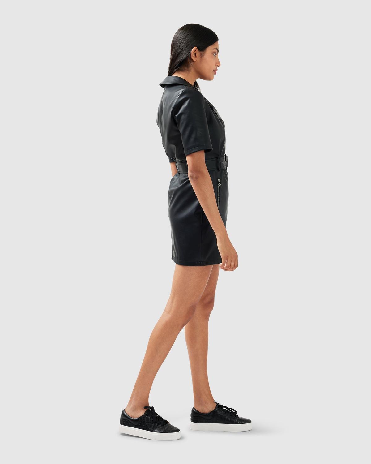 Короткий рукав и мини-силуэт мини-платья Wild Nights из веганской кожи добавляют современный штрих к классическим деталям в байкерском стиле и блестящей фурнитуре серебристого оттенка.