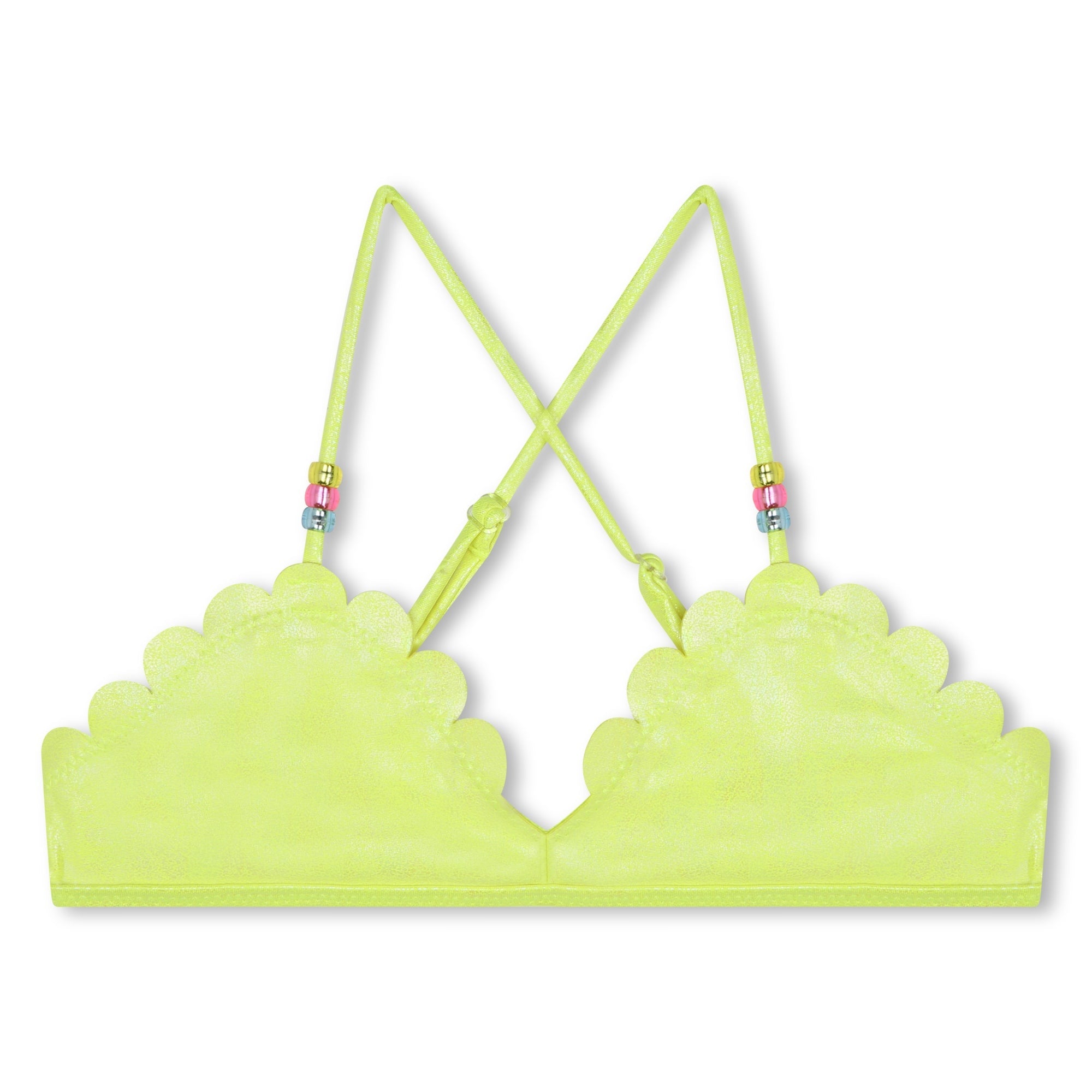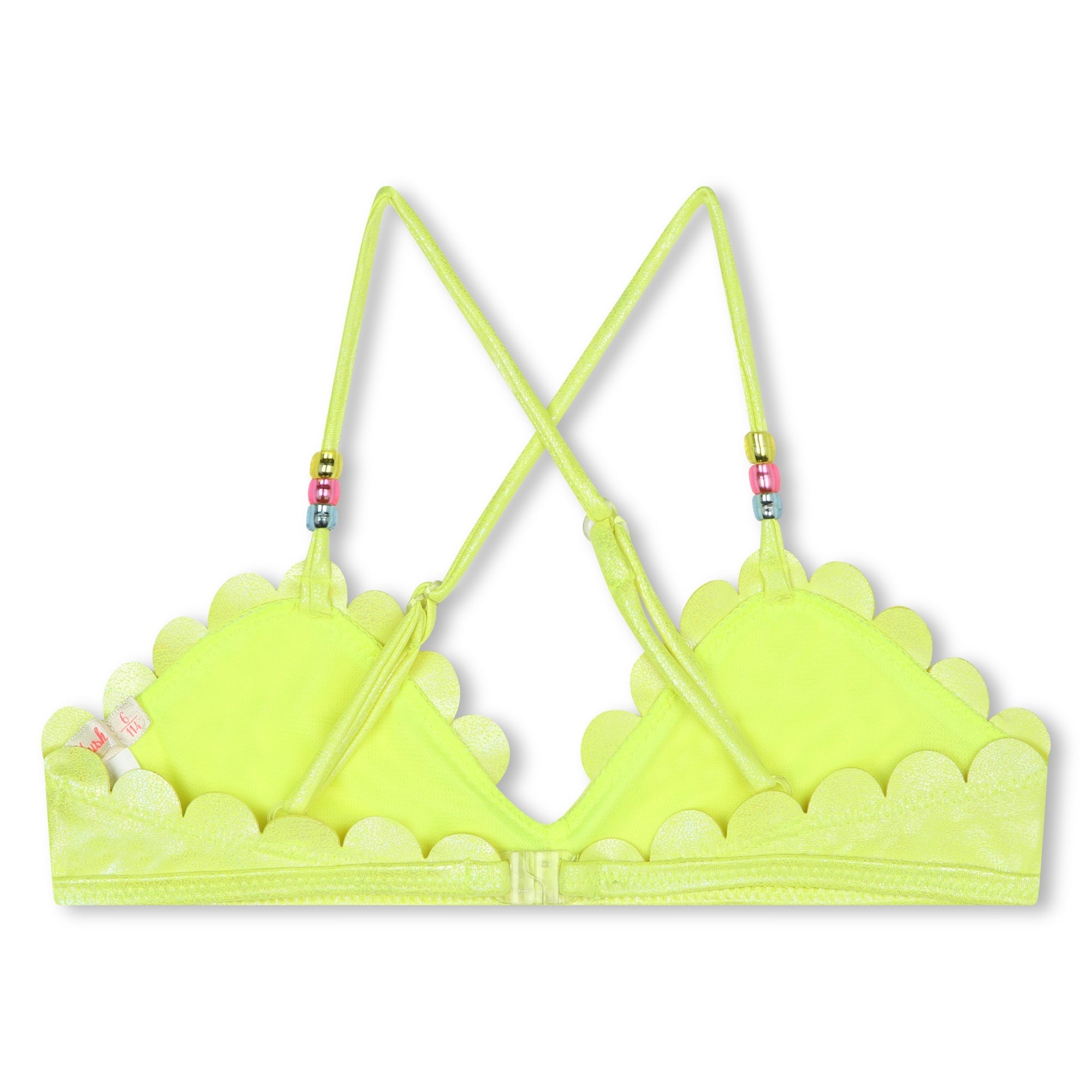 Неоново-зеленый бикини с фестонами для девочек от Billieblush. Флуоресцентный дизайн, блестящие детали и фестончатый край. Перекрестные бретели с застежкой на крючки сверху и накладной стиль снизу.