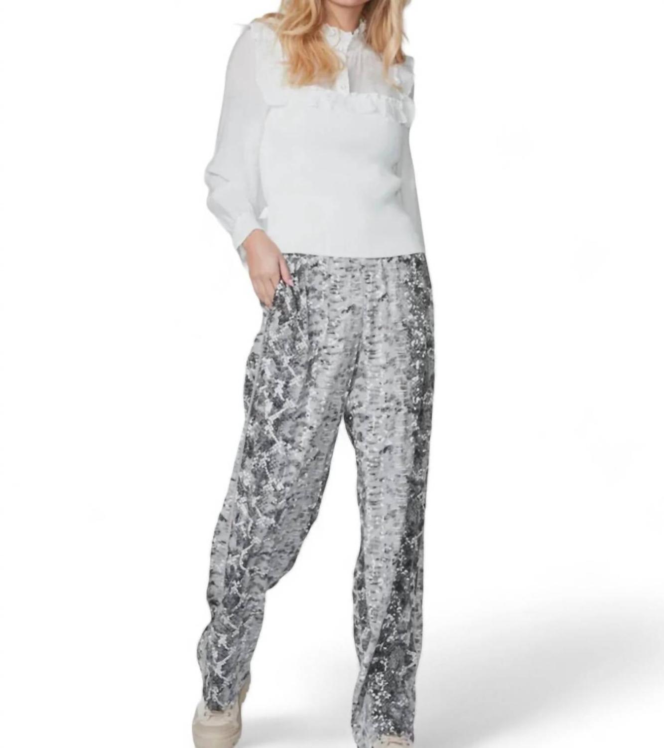 Эти брюки имеют змеиный принт с тонким белым резиновым принтом. Изготовлены из удобной и мягкой ткани, имеют высокую эластичную талию и свободную удобную посадку в ногах. Рост модели 180 см, на ней размер small.