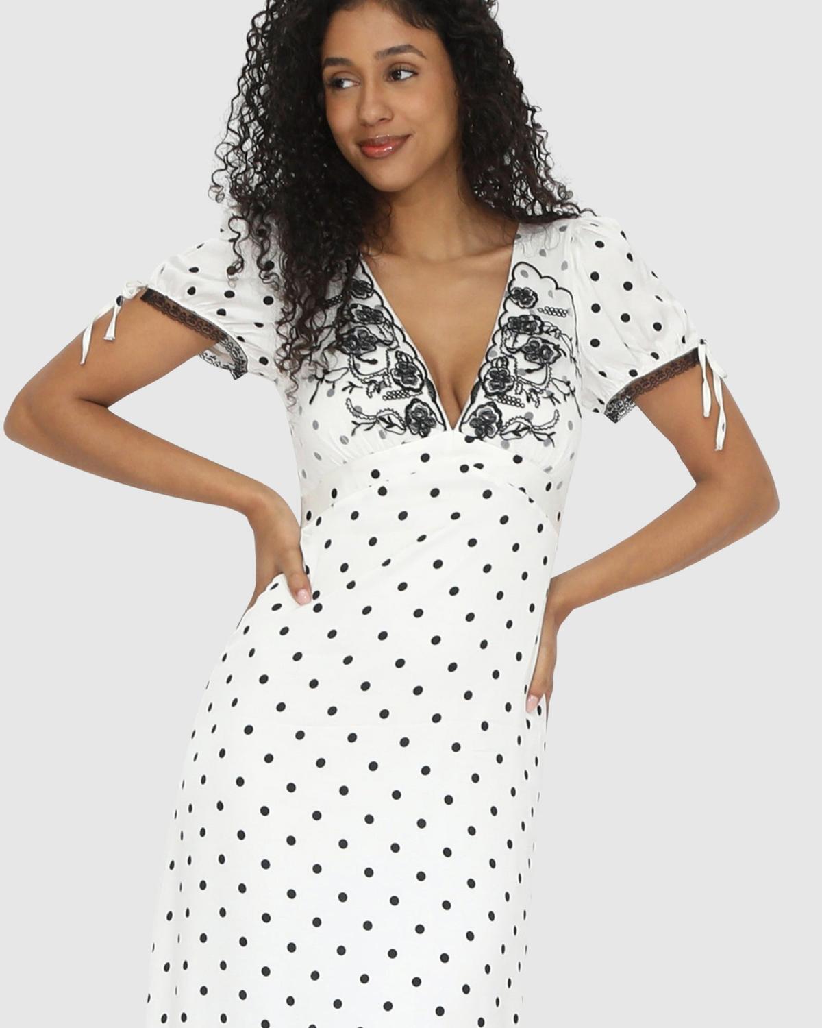 Приготовьтесь к комплиментам в платье-миди You & I Polka Dot с контрастным вышитым лифом и завязывающимися рукавами-фонариками, отделанными кружевом. Мягкий эластичный атлас и молния сзади обеспечивают как стиль, так и комфорт на весь день.