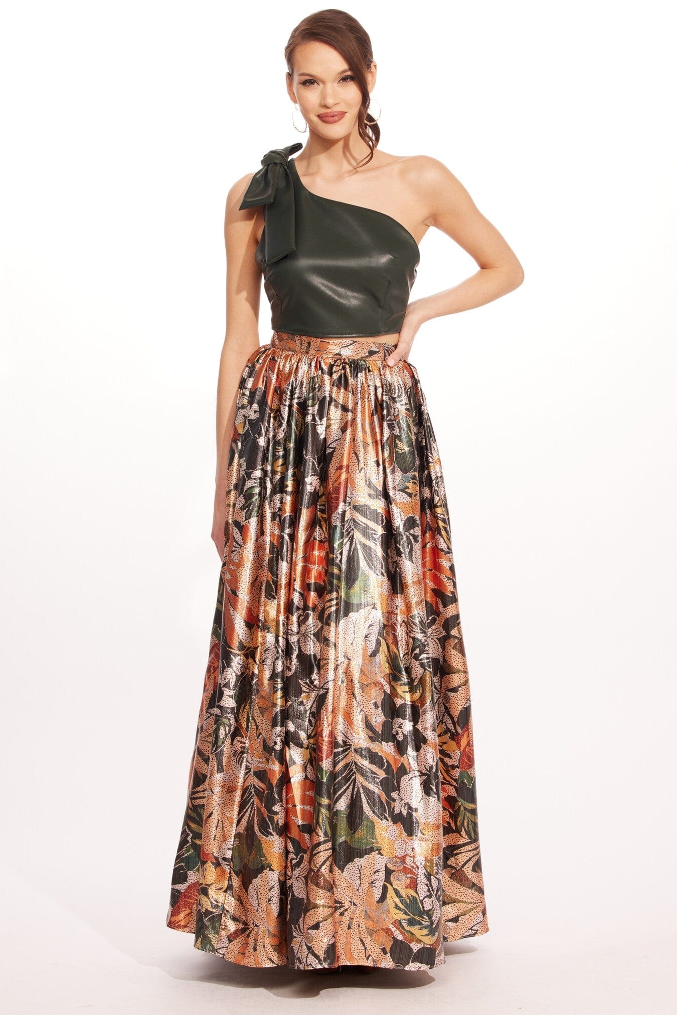 Создайте грандиозный выход с этой сказочной макси-юбкой в складку. С приталенным поясом и боковой молнией, макси-юбка полностью на подкладке выполнена из нашего цветочного принта Glitter Bloom.