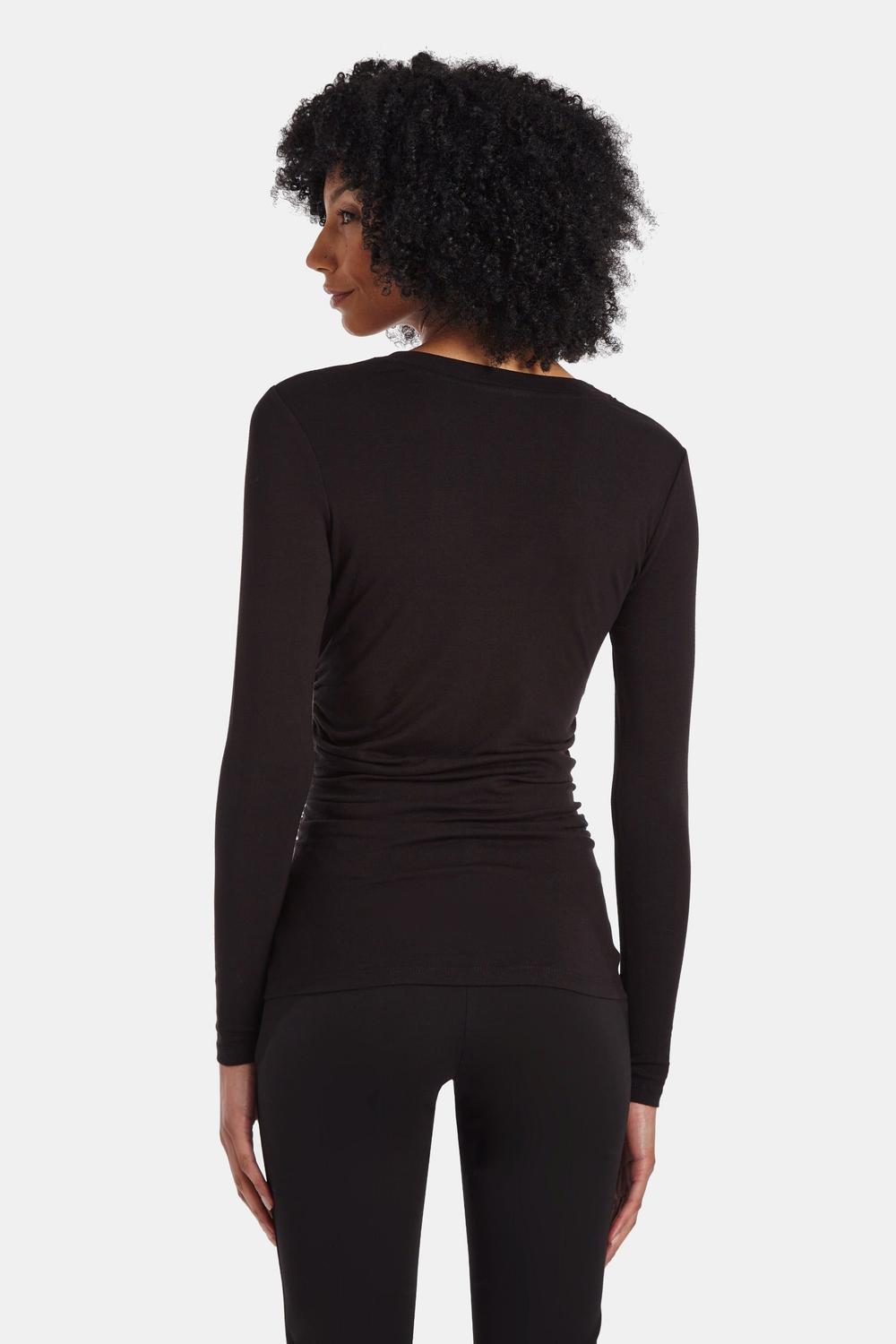 Удобная футболка с V-образным вырезом и небольшими сборками по низу, которая будет отлично смотреться с любым низом.