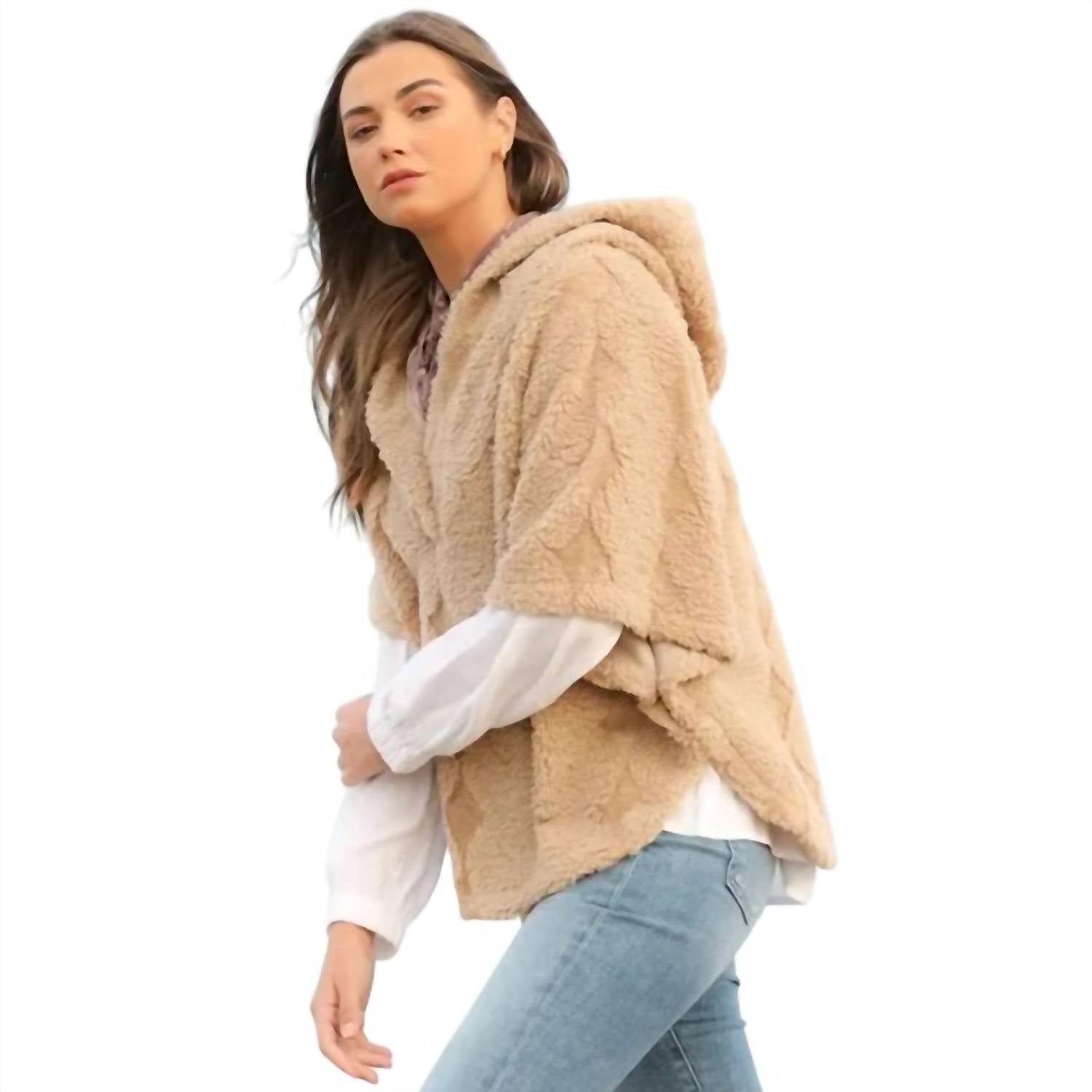 Это пончо с рукавами до локтя изготовлено из 100% супермягкого искусственного меха из полиэстера насыщенного карамельного оттенка. Наслаждайтесь удобной застежкой-липучкой и просторным кроем. Уход прост: машинная стирка в холодной воде и машинная сушка.