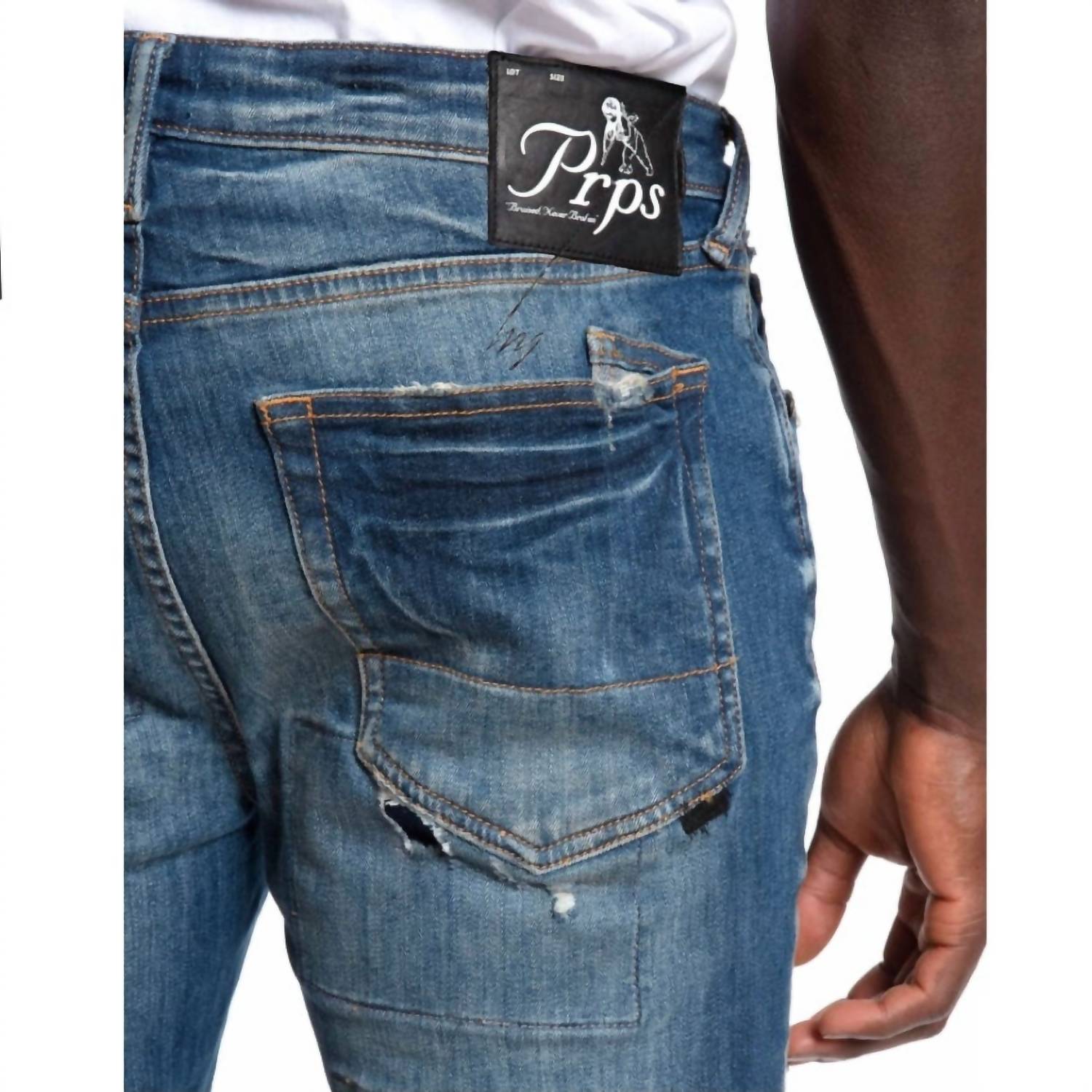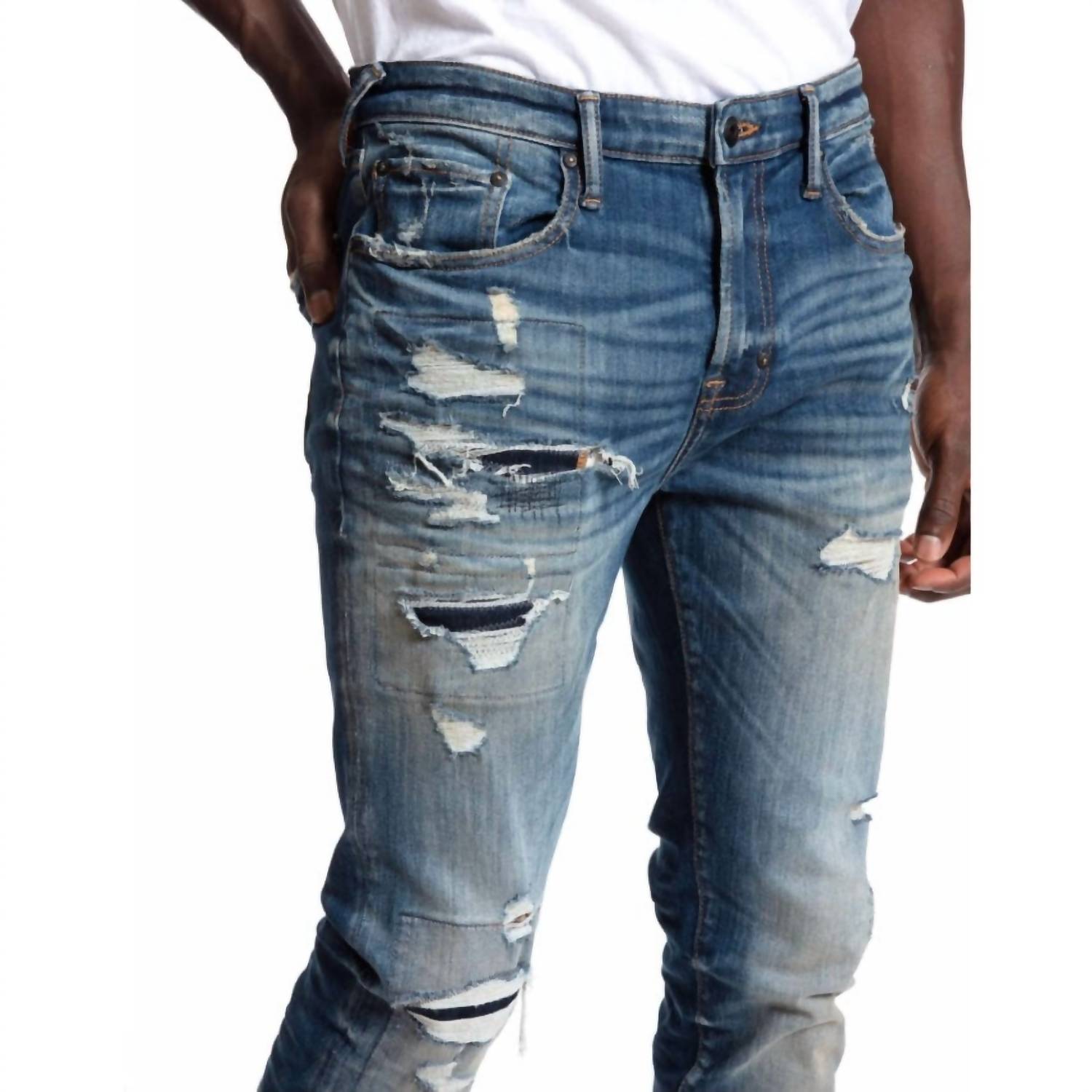 Эти джинсы средней потертости обеспечивают облегающую посадку с немного заниженным шаговым швом, сочетая зауженный, обтягивающий эластичный дизайн с современным стилем. Они имеют усы и стратегически расположенные заштопанные разрывы как спереди, так и сзади. Джинсы включают застежку-молнию и сделаны из 99% хлопка и 1% спандекса для удобства и гибкости. Размеры следующие: отверстие для ног - 12,5 дюймов, передняя посадка - 8,75 дюймов и внутренний шов - 34,5 дюйма.