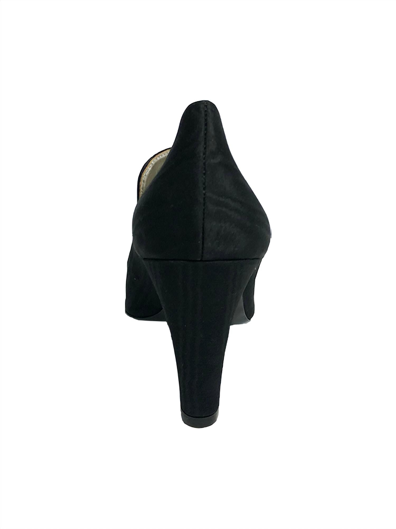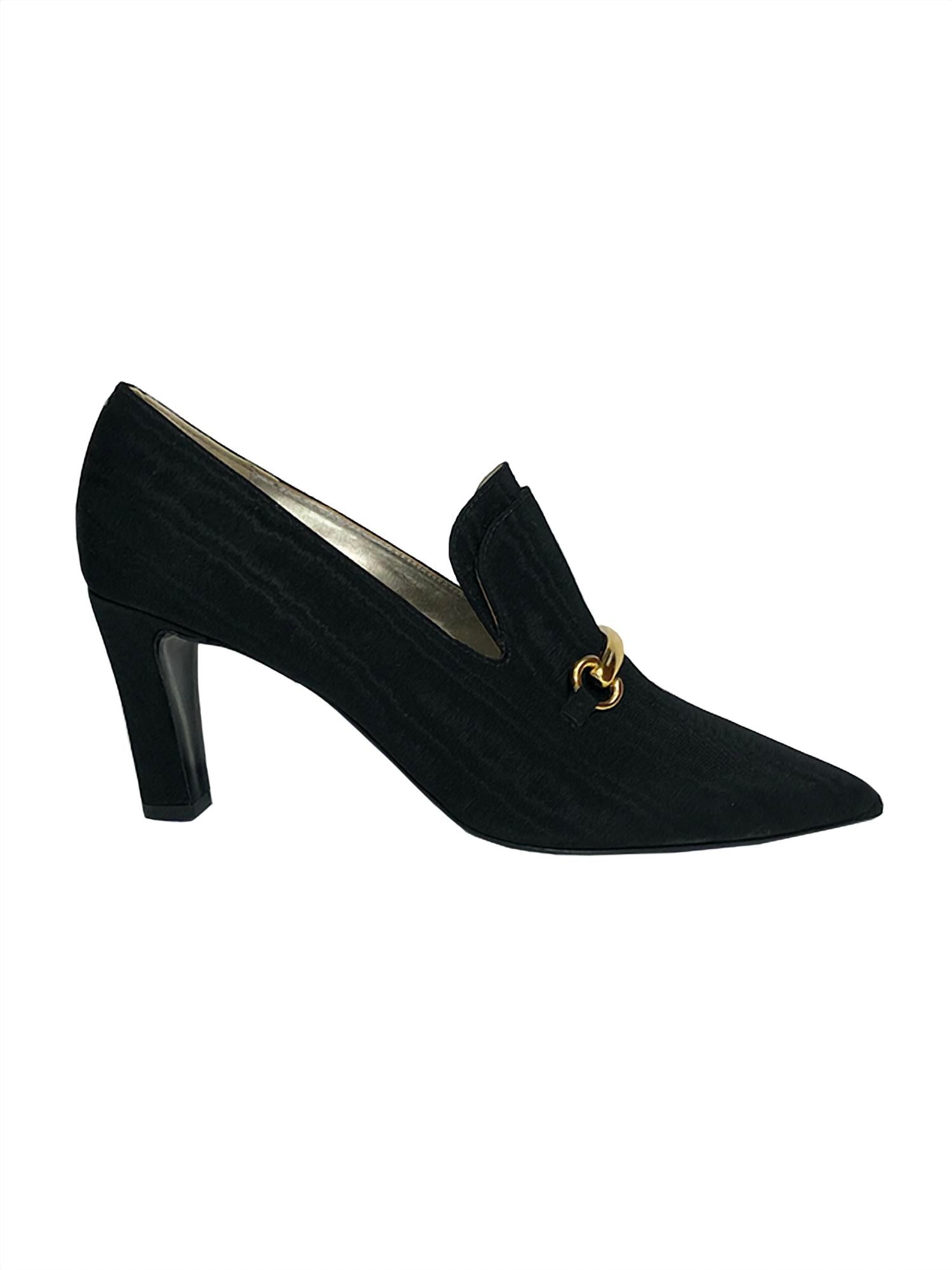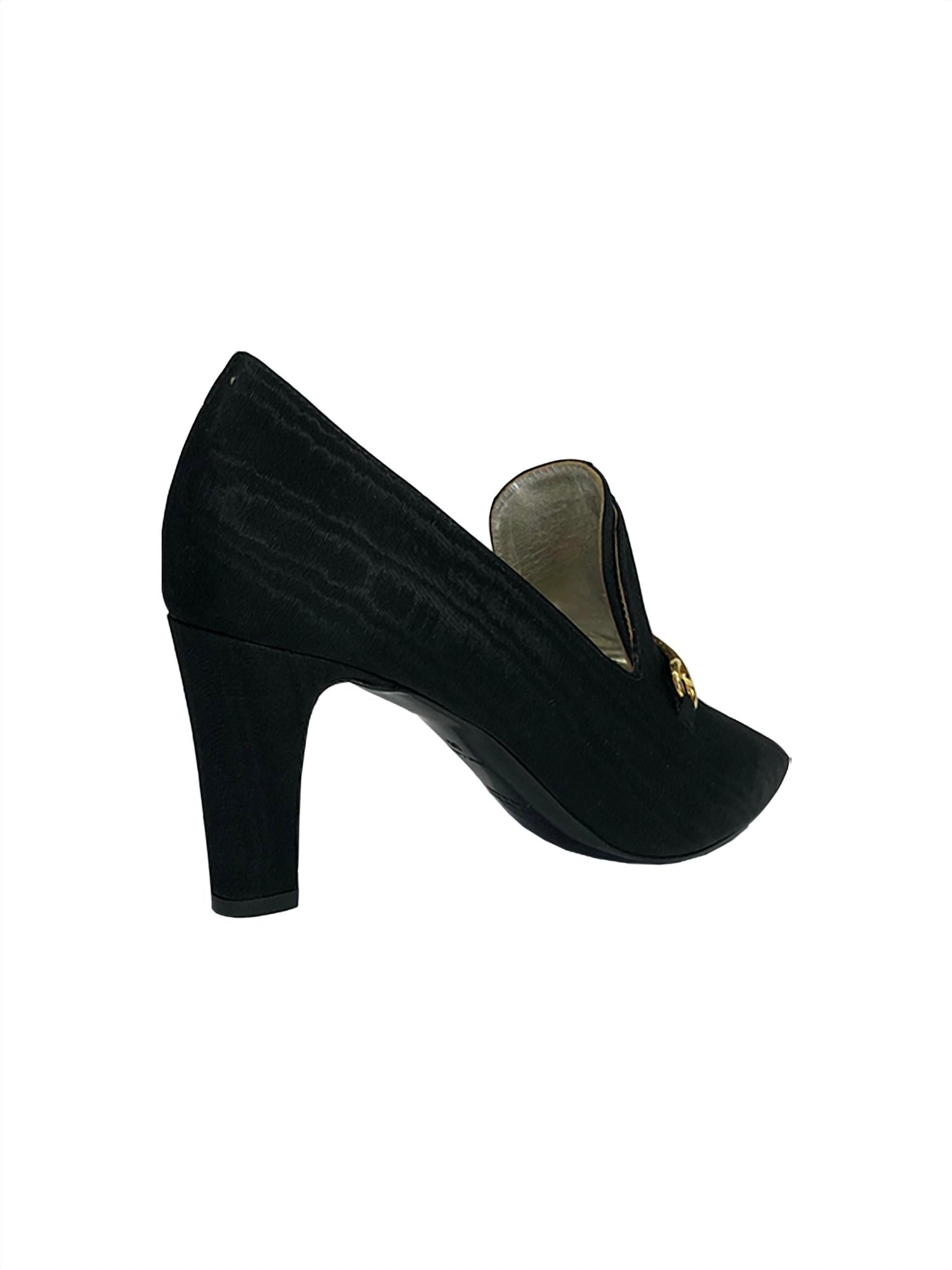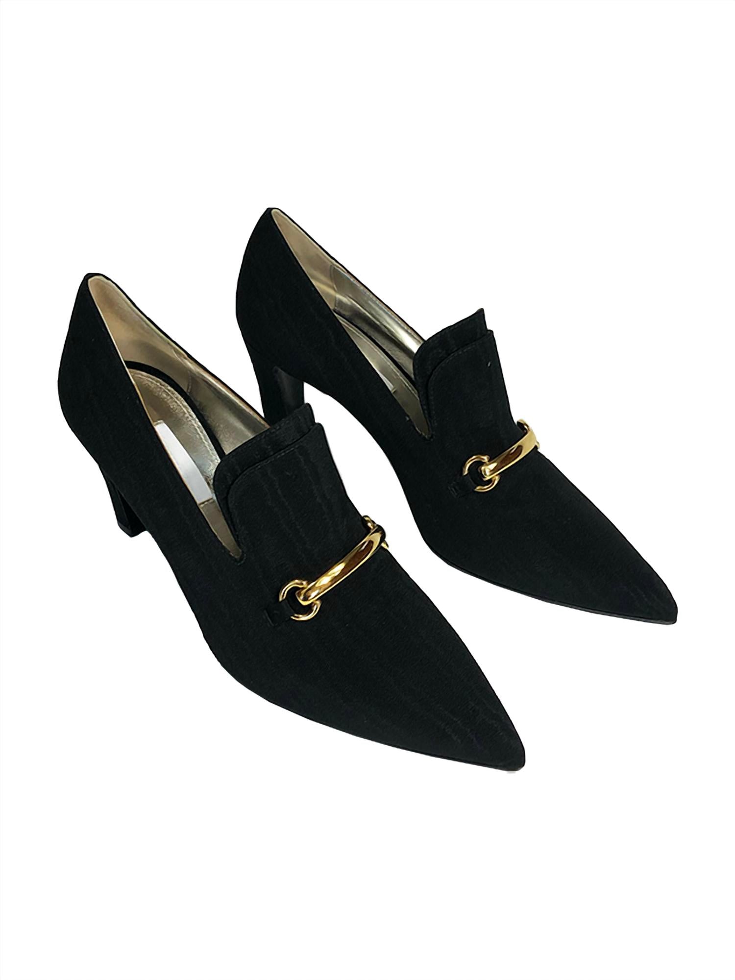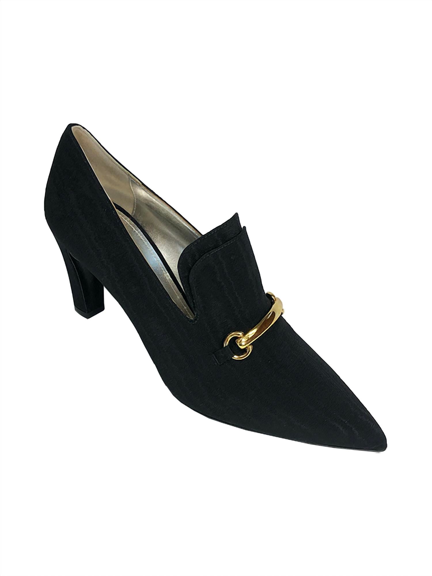 Шагните в изысканность. Поразительное сочетание элегантности и современного дизайна. Изготовлены из роскошного черного муара. Отличаются яркой деталью в виде двойного язычка с латунной планкой, добавляющей шикарный конный стиль. Подкладка из золотой кожи и кожаная подошва обещают комфорт. Конический каблук-катушка высотой 2,75 дюйма придает образу изысканность. Сделано в Италии.