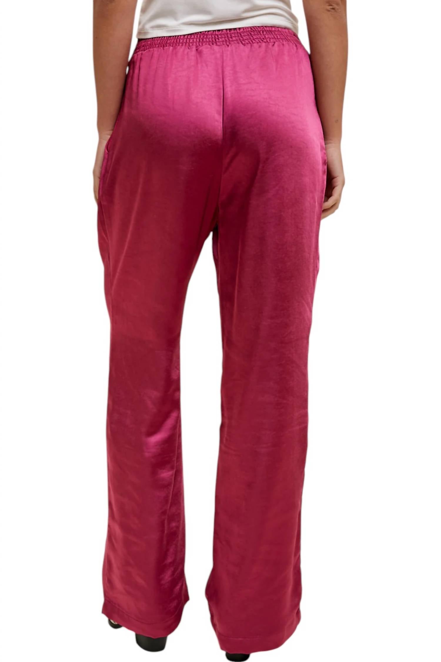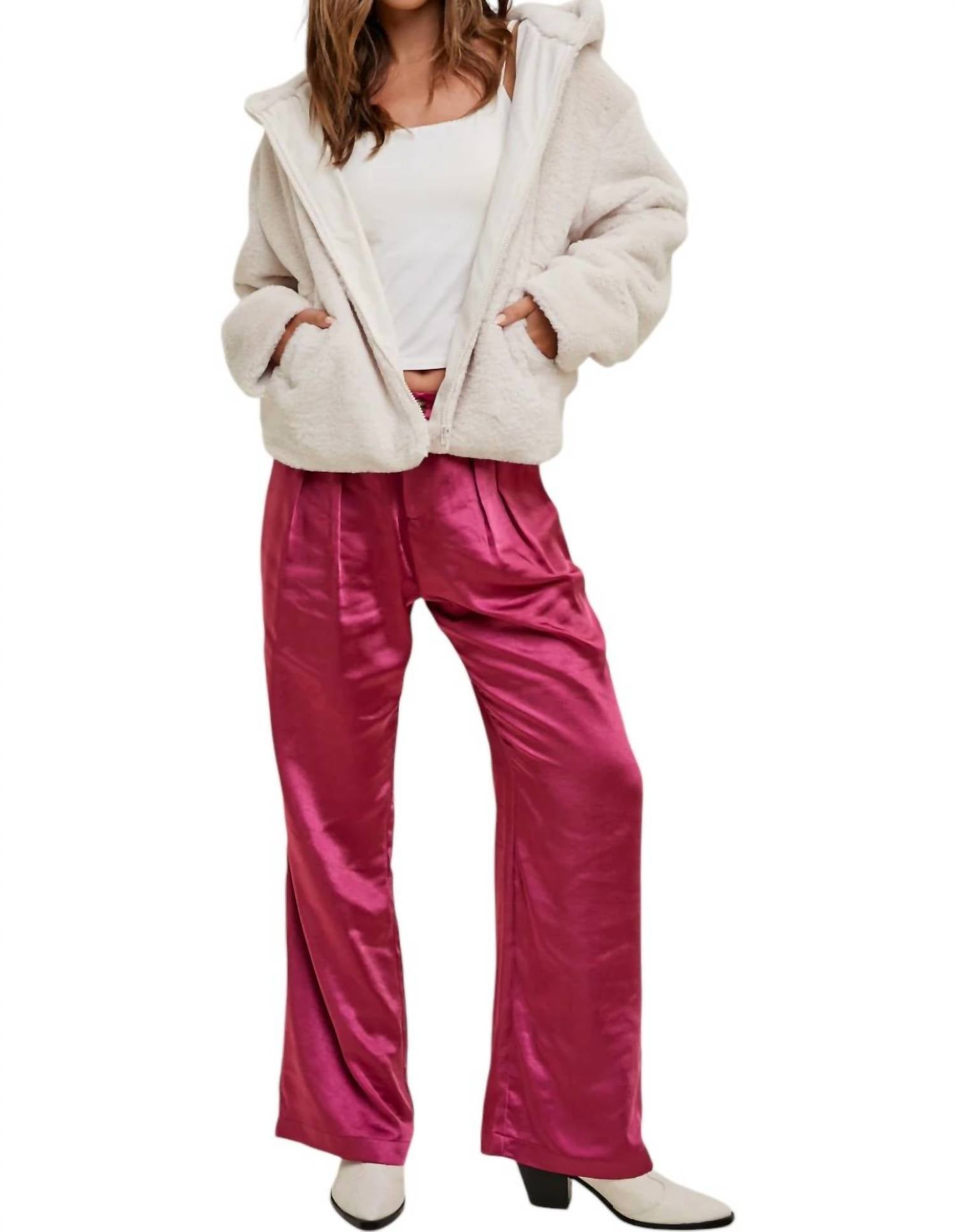 Широкие брюки из атласа с плиссировкой, застежкой на пуговицу и молнию, эластичным поясом сзади и боковыми карманами. Изготовлены из 100% полиэстера.