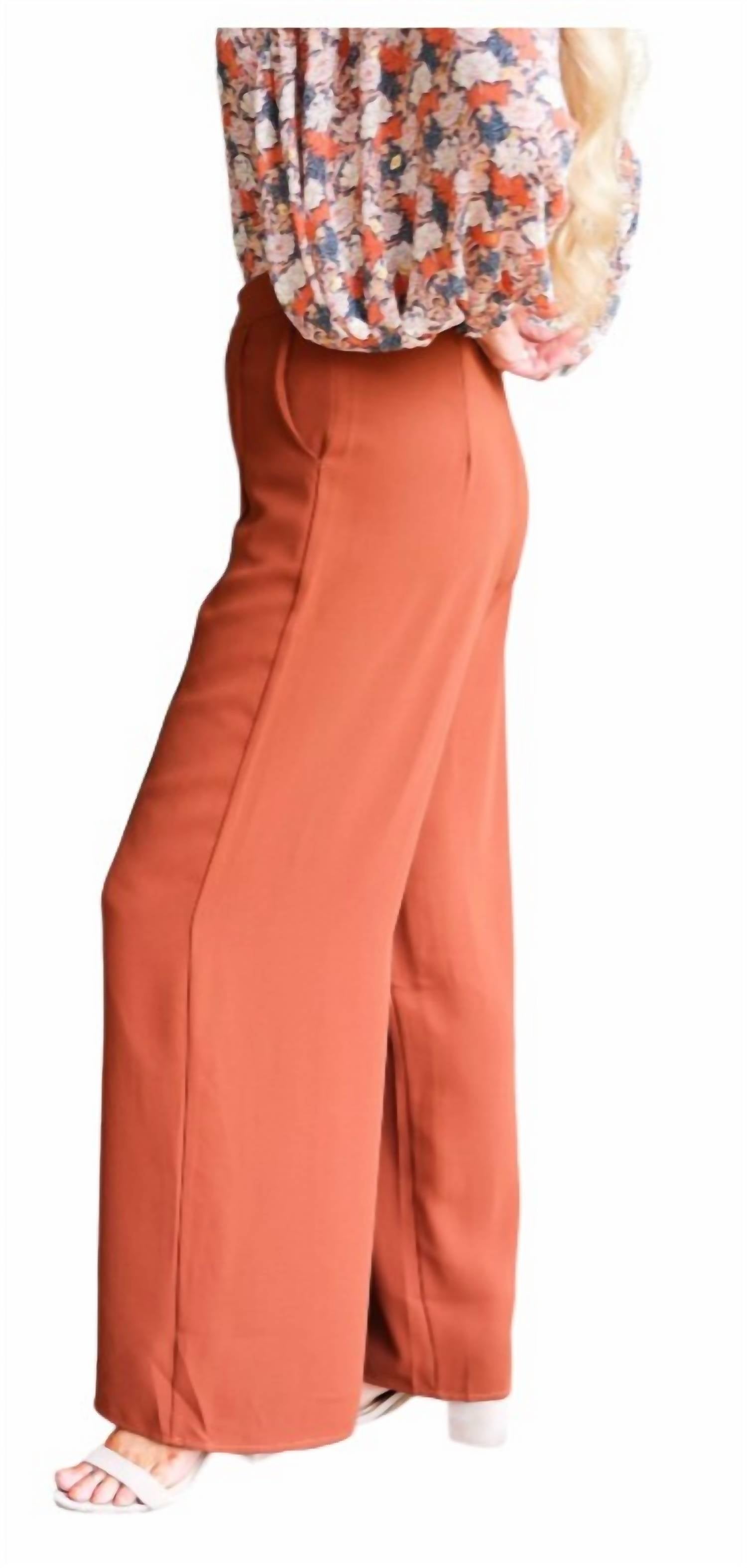 Широкие брюки карамельного цвета. Защипы спереди. Боковые карманы. Чистый пояс. 100% полиэстер.