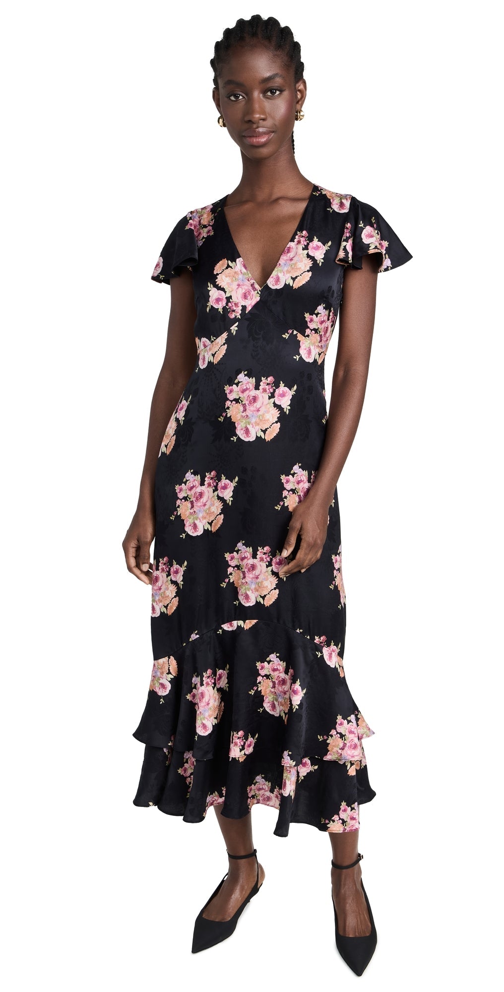 LoveShackFancy Женское платье-миди Elowen Black Pearl Flora Satin Jacquard