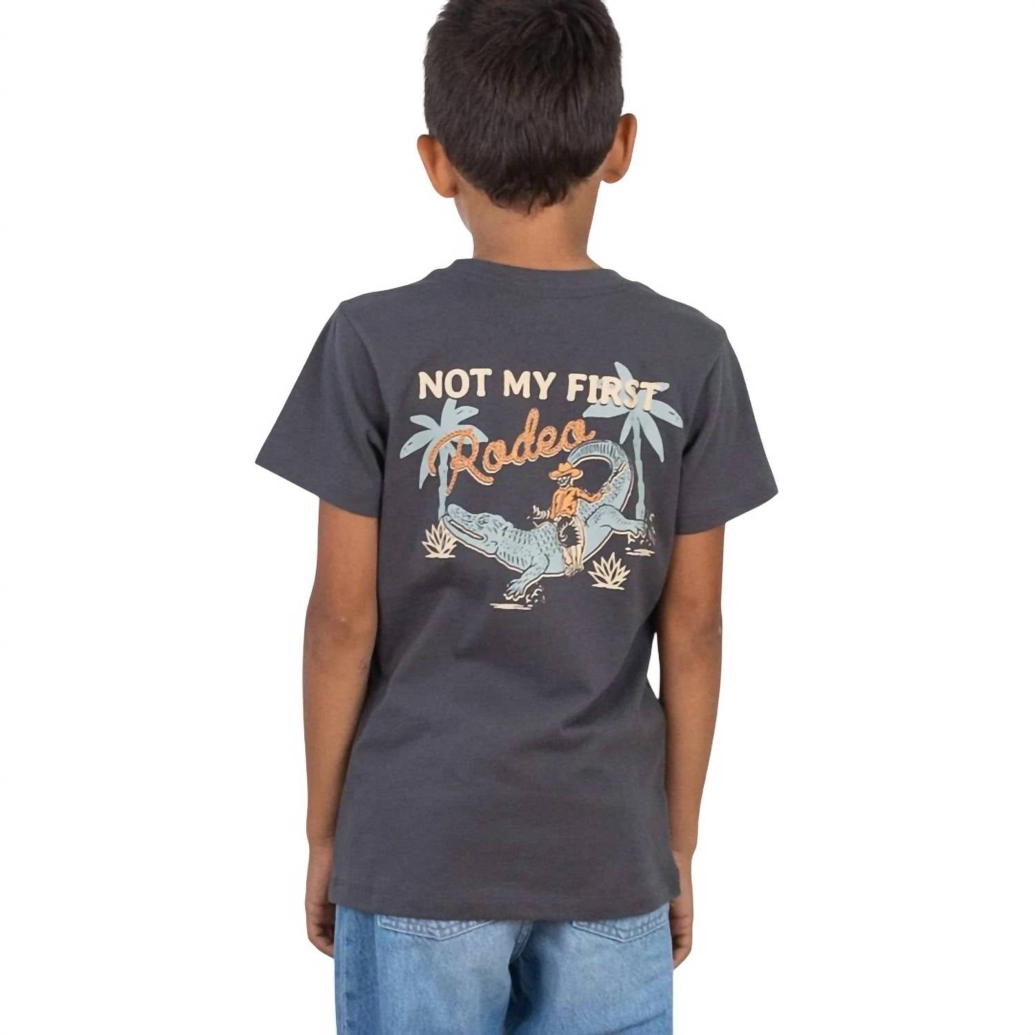 Эта футболка из хлопкового джерси с коротким рукавом выполнена в стильном винтажном черном цвете и идеально подходит для любого повседневного образа для мальчиков. Изготовленная из 100% хлопка, она обеспечивает комфорт и имеет захватывающую графику, напечатанную нетоксичными чернилами на водной основе. Эту футболку можно стирать в стиральной машине.