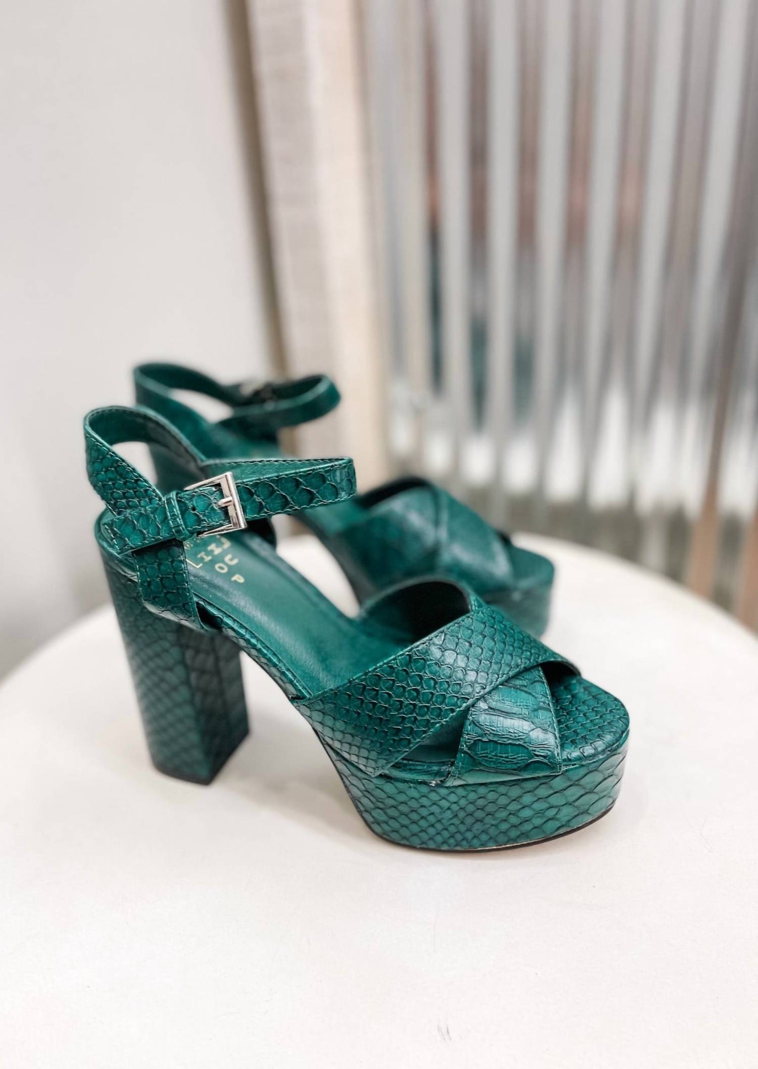 Каблуки Shu Shop Eugenia. Наши босоножки на платформе EUGENIA в стиле диско 1970-х годов изготовлены из искусственной змеиной кожи с перекрещивающимися ремешками и прочной пряжкой. Высокий, массивный каблук идеально сбалансирован удобной платформой. Зеленый цвет. Перекрещивающиеся ремни и пряжка. Высота каблука - 14,5 см.