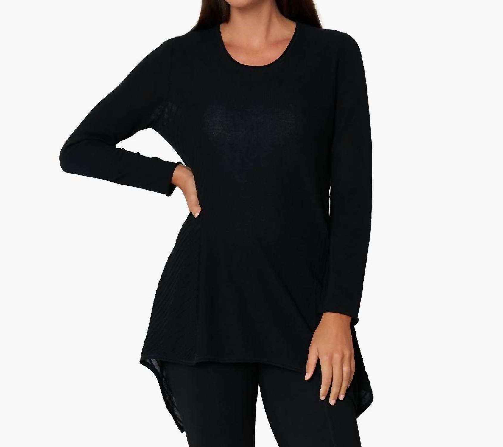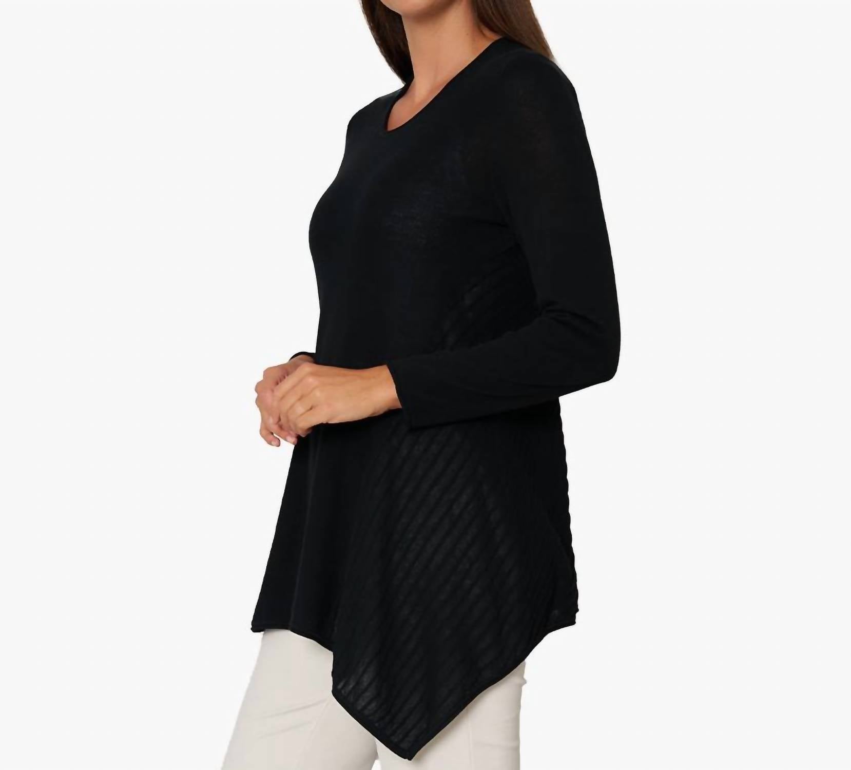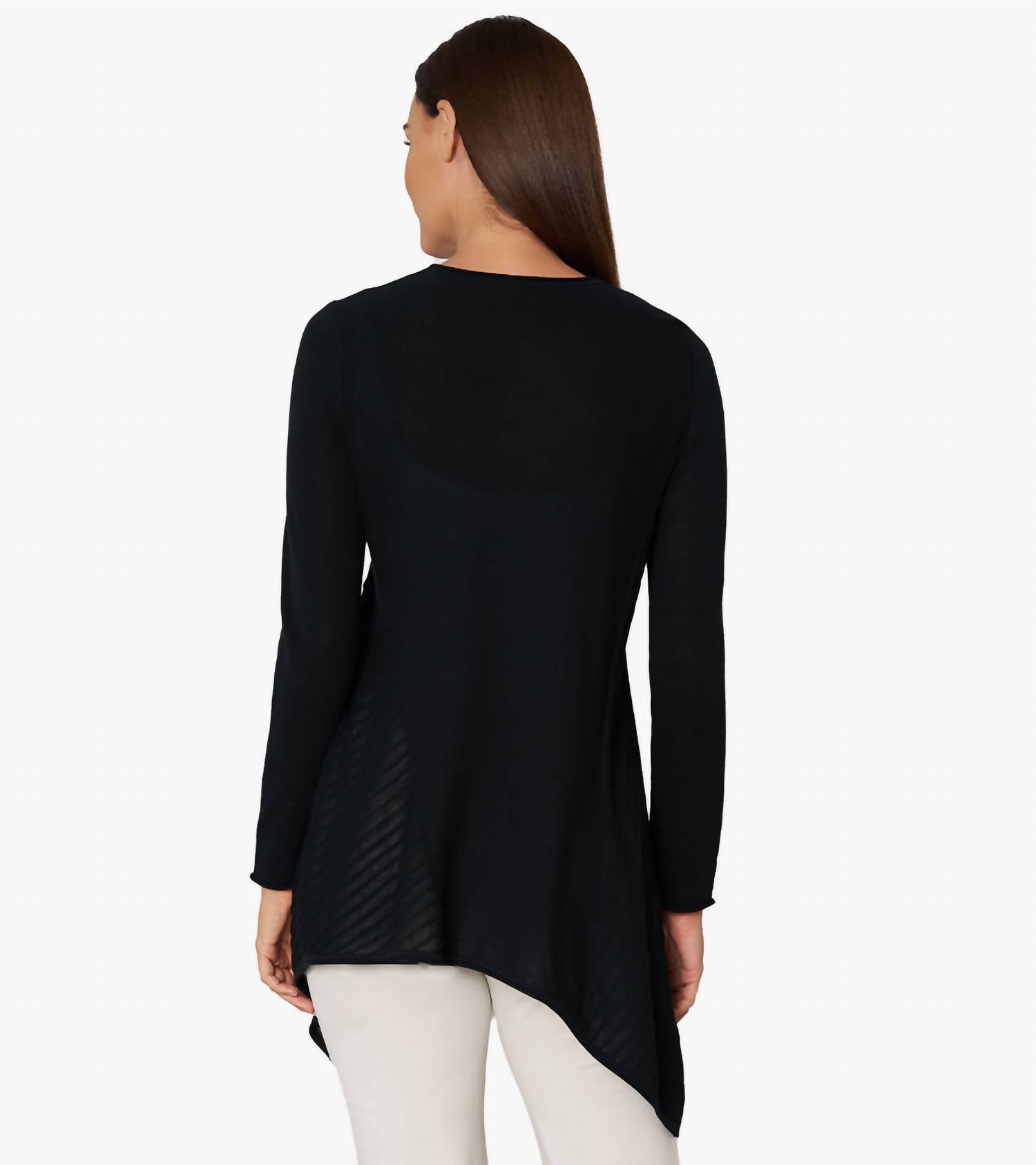 Искусно связано с уникальным асимметричным подолом А-силуэта и соблазнительным круглым вырезом. Длина по спинке составляет около 28 дюймов для размера S. Модель ростом 5 футов 11 дюймов носит размер S.