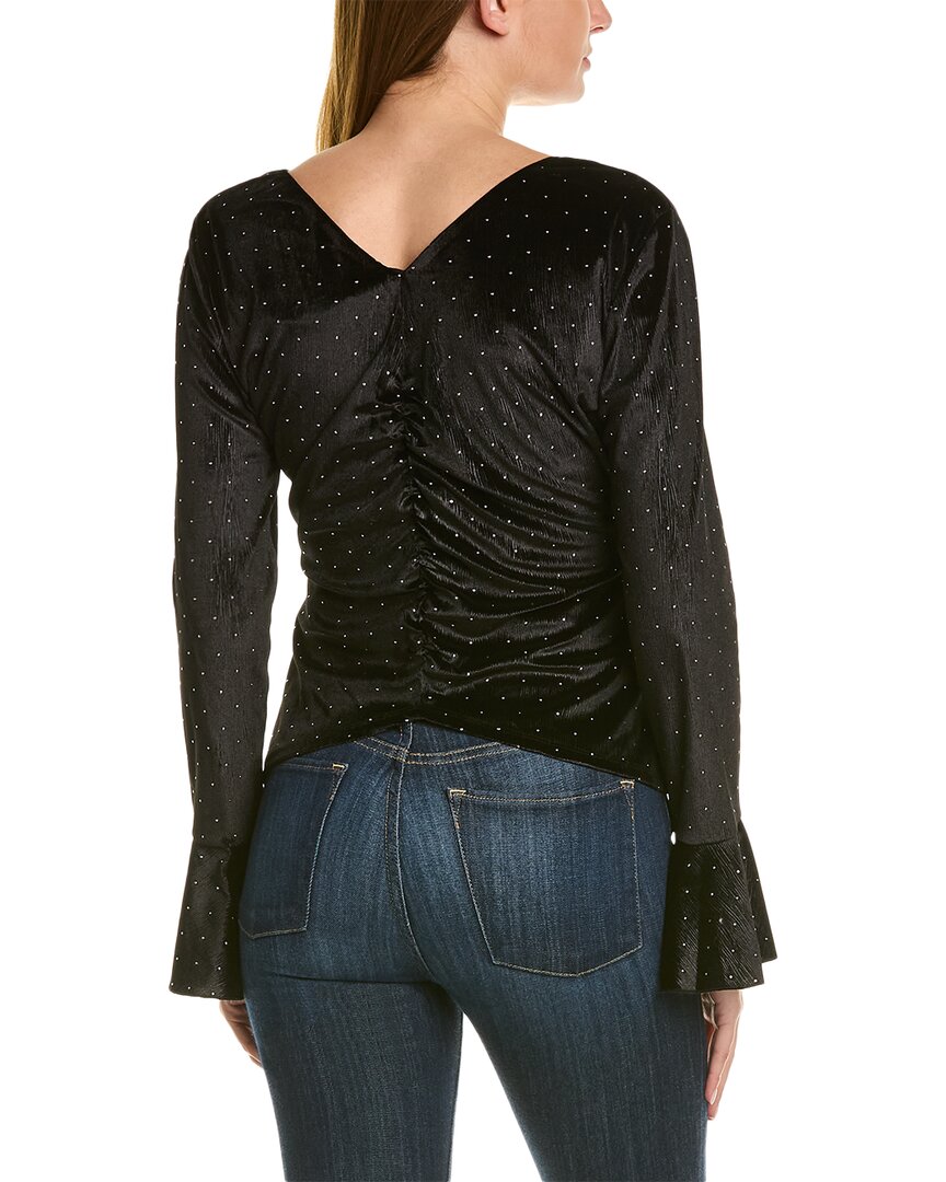 • Топ черного цвета с рюшами, V-образным вырезом, манжетами-воланами и отделкой бисером