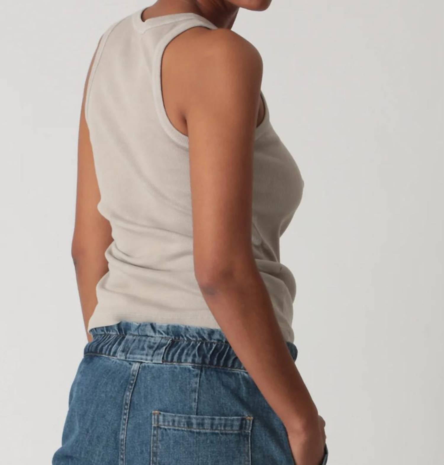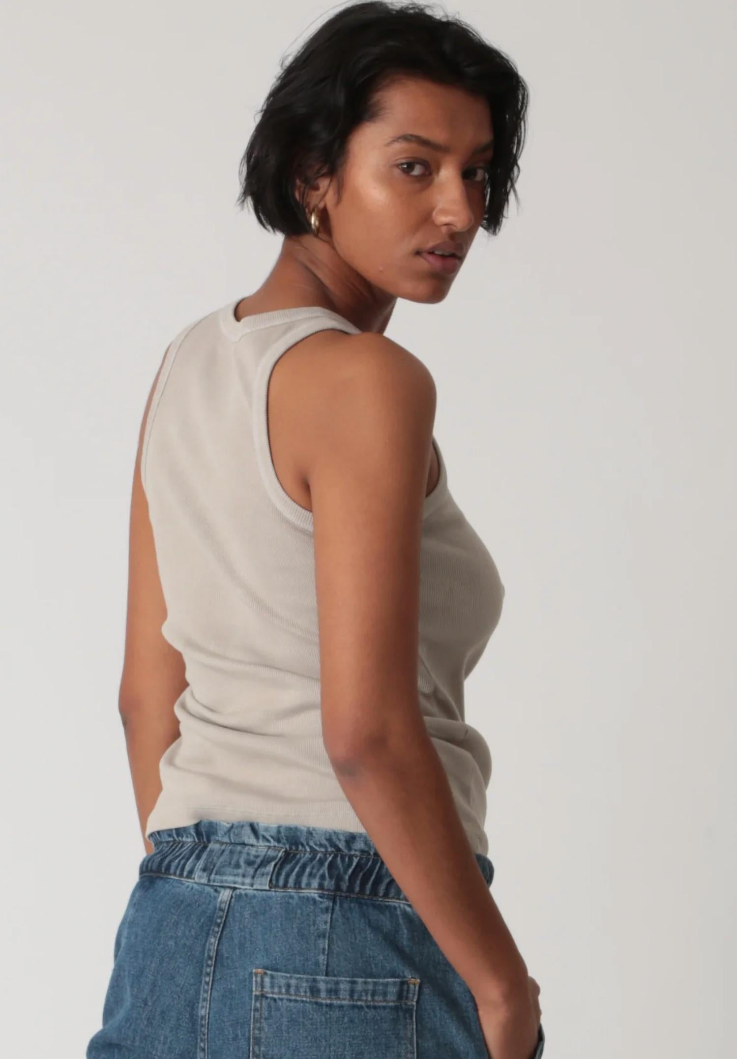 Без рукавов. Вырез горловины «лодочка». Модель надевается. Изготовлена из фирменной эластичной ткани в рубчик. Идеально подходит для ношения в качестве слоя или отдельно. 95% хлопок, 5% спандекс. Можно стирать в стиральной машине; сушить в стиральной машине при низкой температуре. Сделано в США.