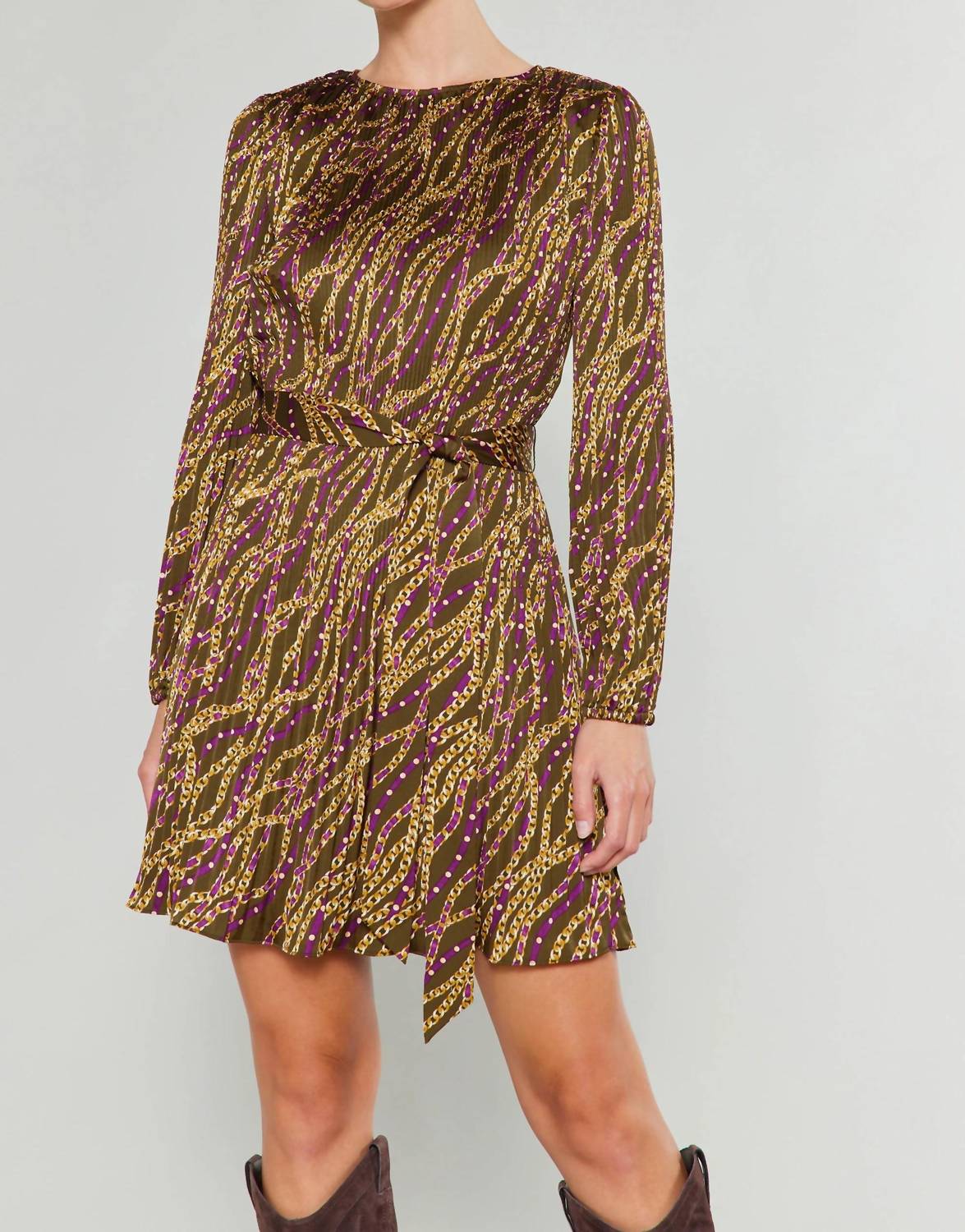 Это мини-платье с длинными рукавами и соблазнительным принтом в виде золотых звеньев искусно изготовлено из 100% полиэстера, что обеспечивает легкость. Сделано в Китае, имеет эластичные манжеты и изящную завязывающуюся талию, завершенную завязкой. Круглый вырез и замысловатая отделка складками добавляют нотку элегантности, при этом платье идет размер в размер.