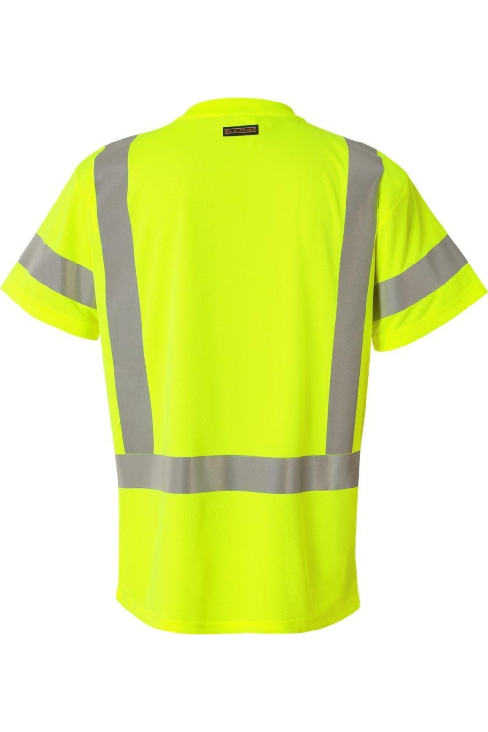 4,13 унции/ярд, 100% микроволокнистый полиэстеровый материал отводит влагу. 2 широких высокоэффективных светоотражающих элемента. Левый нагрудный карман. Лайм (9118), оранжевый (9119). Соответствует ANSI 107 Type R Class 3.