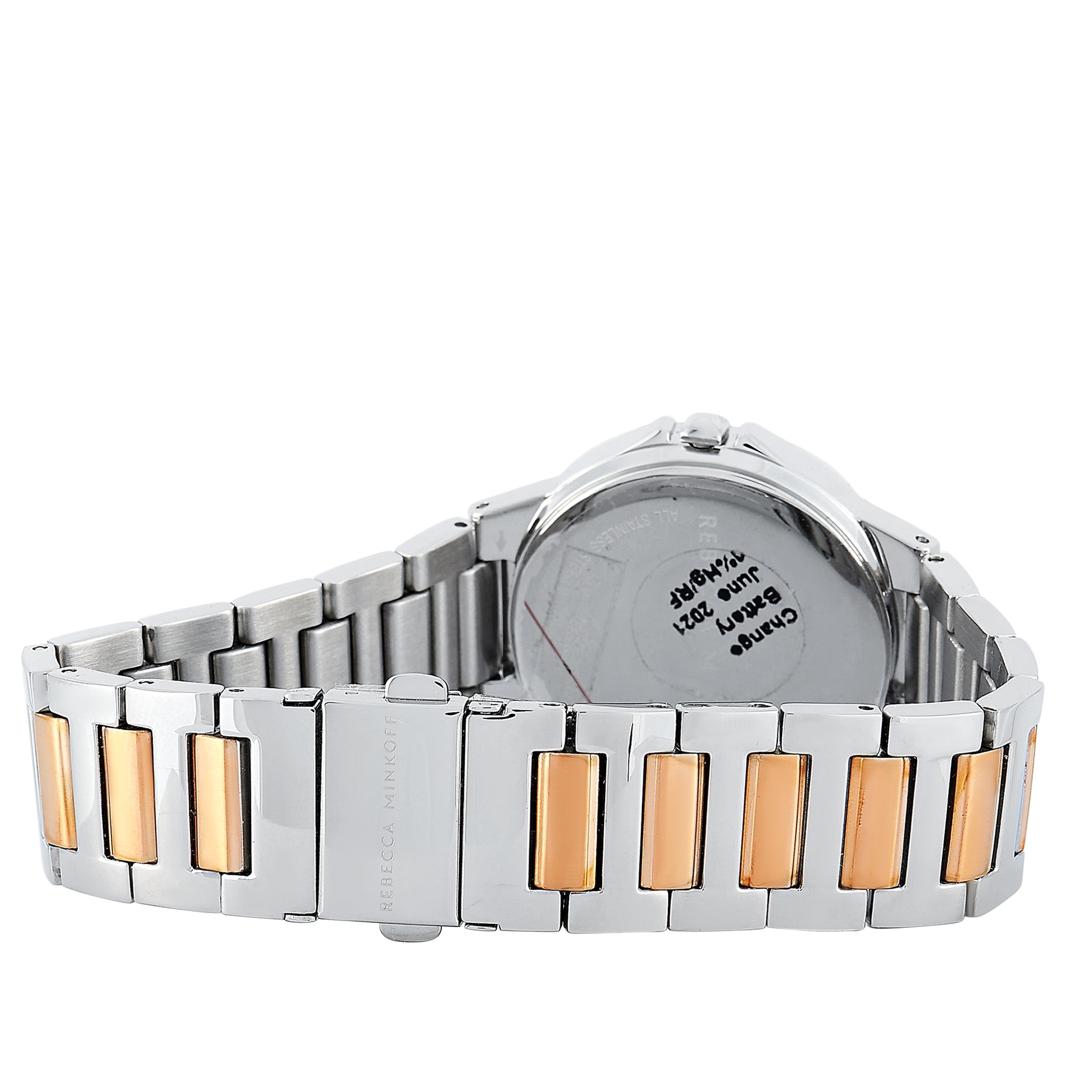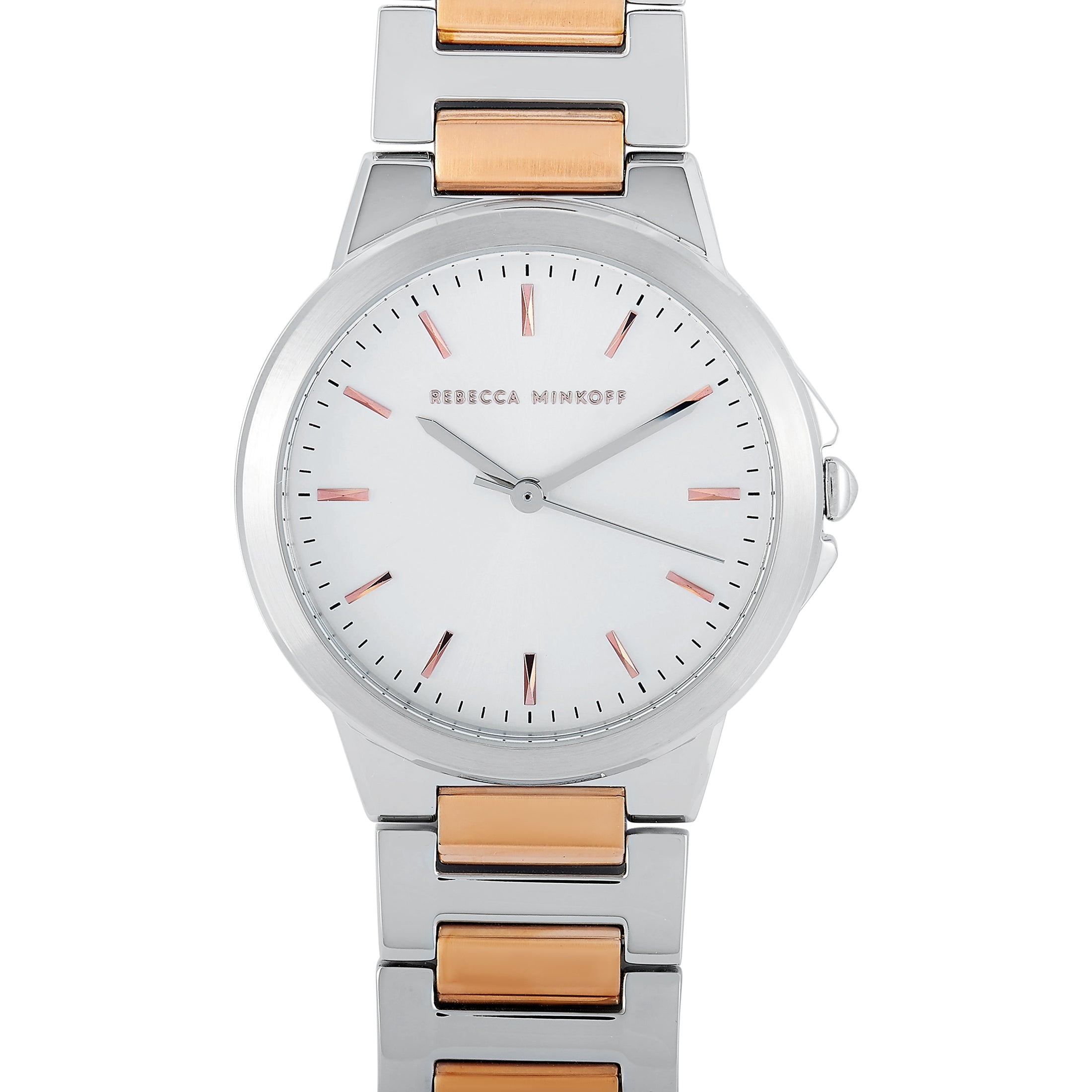 Это Rebecca Minkoff Cali, номер модели 2200324. Часы представлены в корпусе из нержавеющей стали серебристого тона диаметром 34 мм. Корпус водонепроницаем до 30 метров и установлен на двухцветном браслете из нержавеющей стали. Эта модель оснащена кварцевым механизмом. Серебристо-белый циферблат имеет центральные часы, минуты и секунды. Эти часы предлагаются в неношеном состоянии и включают коробку производителя и документы.
