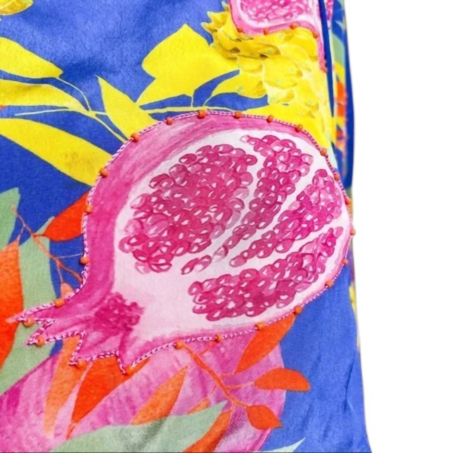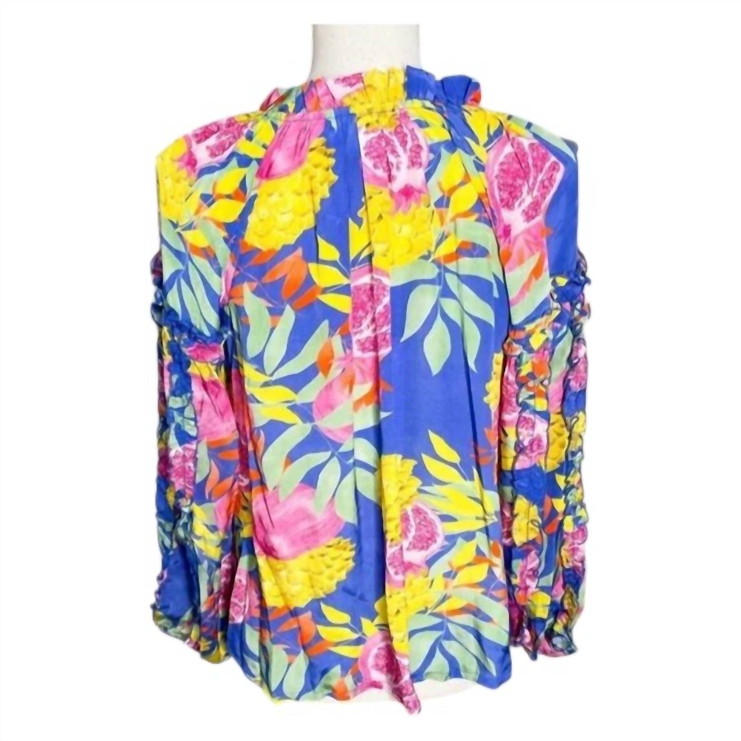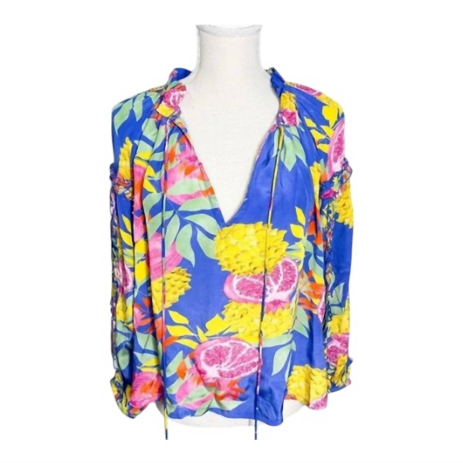 Универсальная блузка, которая подойдет и для работы, и для ужина! Примите яркий стиль с ARIZONA TOP от TAJ by SABRINA CRIPPA. Этот тропический топ отличается привлекательными длинными рукавами-фонариками с эластичными манжетами для удобной посадки. Украшенный ярким принтом с фруктами и листьями, он включает очаровательный галстук на шее, отделанный кисточками. Идеально подходит для добавления нотки экзотики в ваш гардероб.