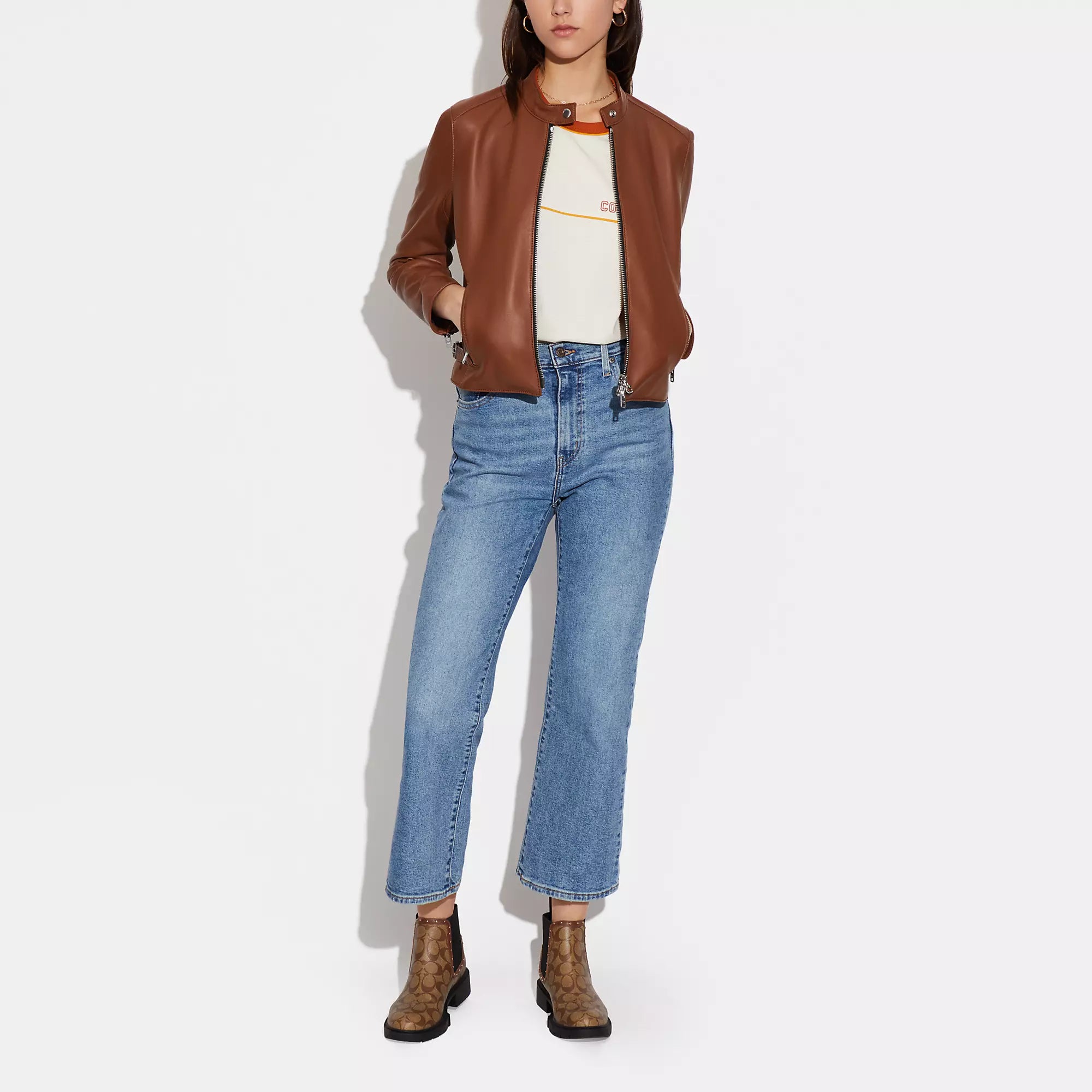 100% кожа ягненка Подкладка - 58% полиэстер 42% вискоза Застежка-молния Карманы на молнии Длина - 19 1/4 Модель ростом 5 футов 10 дюймов (178 см) обхват груди 31 (79 см) обхват талии 24 (61 см) обхват бедер 35 (89 см) и носит размер S | Coach Outlet Кожаная гоночная куртка - коричневая, Medium