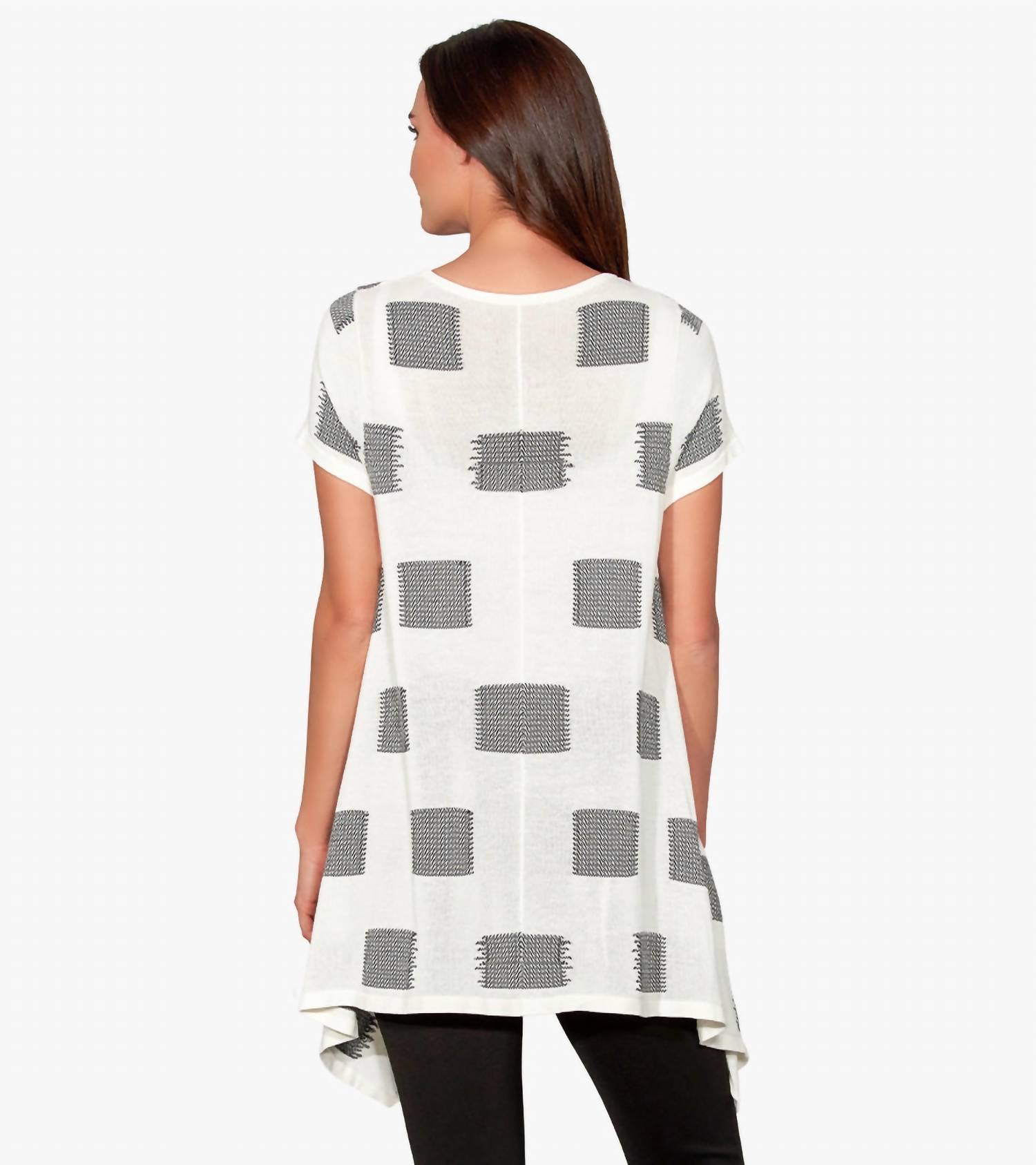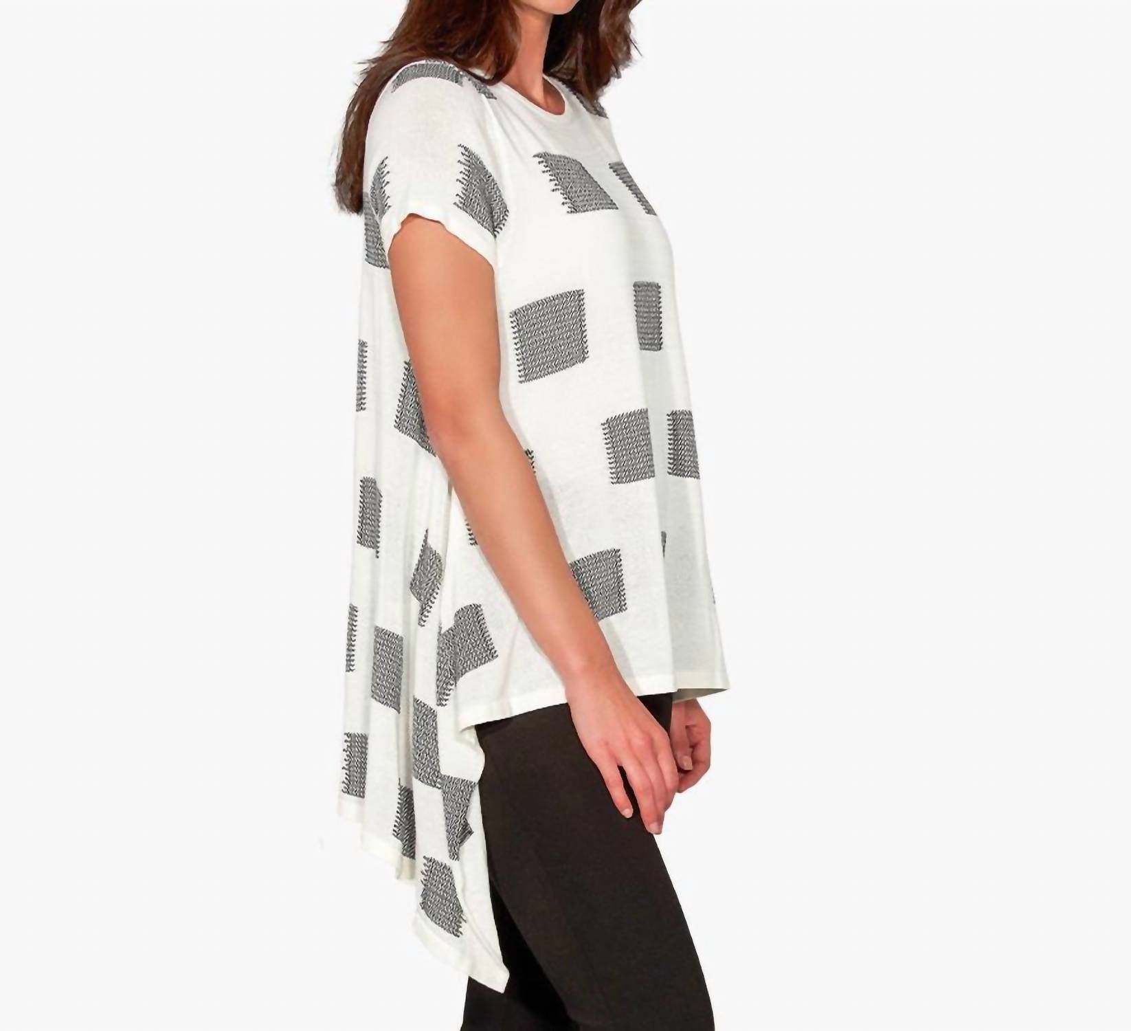 Замысловатые вязаные квадраты, контрастные цвета и привлекательный А-образный крой. Высокий/низкий подол. 75% гребенной хлопок / 25% модал. Импортируется. Ручная стирка и сушка в разложенном виде.