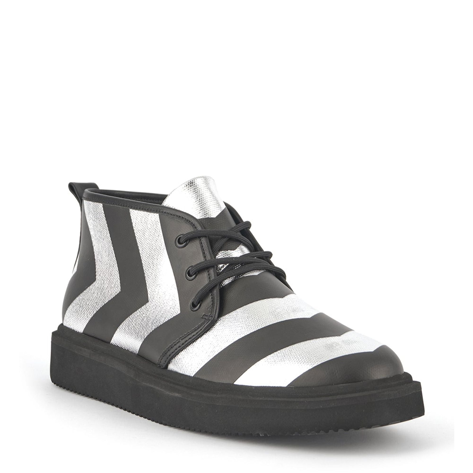 UN Geo Desert — это современные унисекс-ботинки для пустыни, переосмысленные с гладкими формованными резиновыми подошвами, кожаными вставками и шевронной графикой, отпрессованной под давлением. Уход за изделием — металлический верх обработан уникальным фольгированным покрытием, которое может выцветать при обычном ношении. Чтобы избежать потертостей, избегайте попадания влаги и используйте средства для защиты и ухода за обувью, предназначенные для металлической отделки.