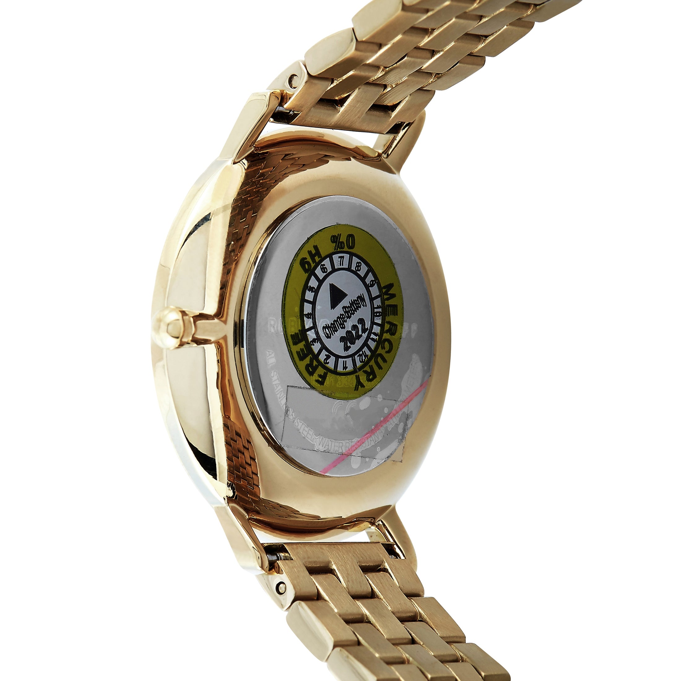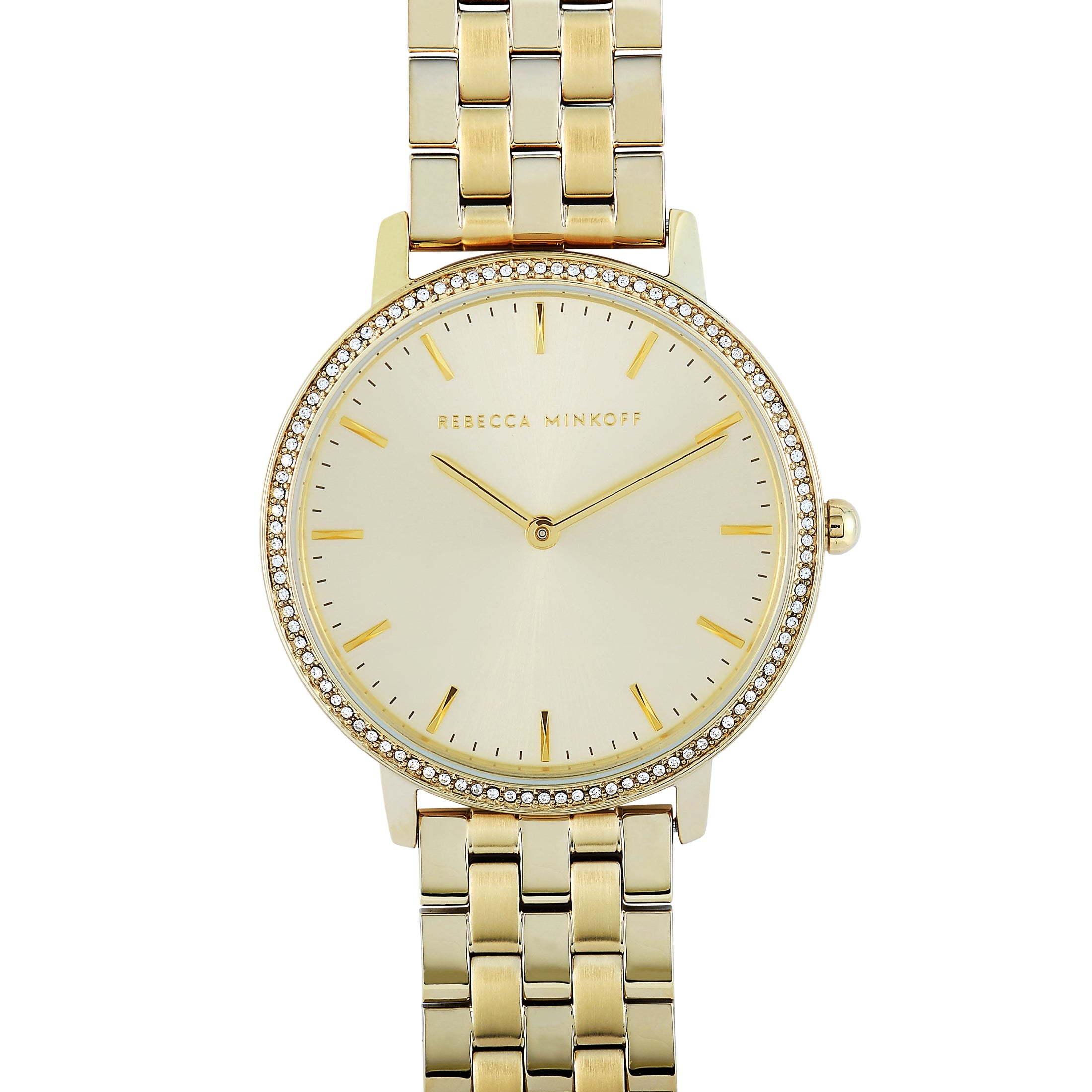 Это Rebecca Minkoff Major, номер ссылки 2200348. Часы имеют корпус из нержавеющей стали золотистого оттенка диаметром 35 мм, украшенный кристаллами. Корпус водонепроницаем до 30 метров и установлен на браслет из нержавеющей стали золотистого оттенка. Часы оснащены кварцевым механизмом и показывают часы и минуты на золотом циферблате. Эти часы предлагаются в неношеном состоянии и включают коробку производителя и документы.