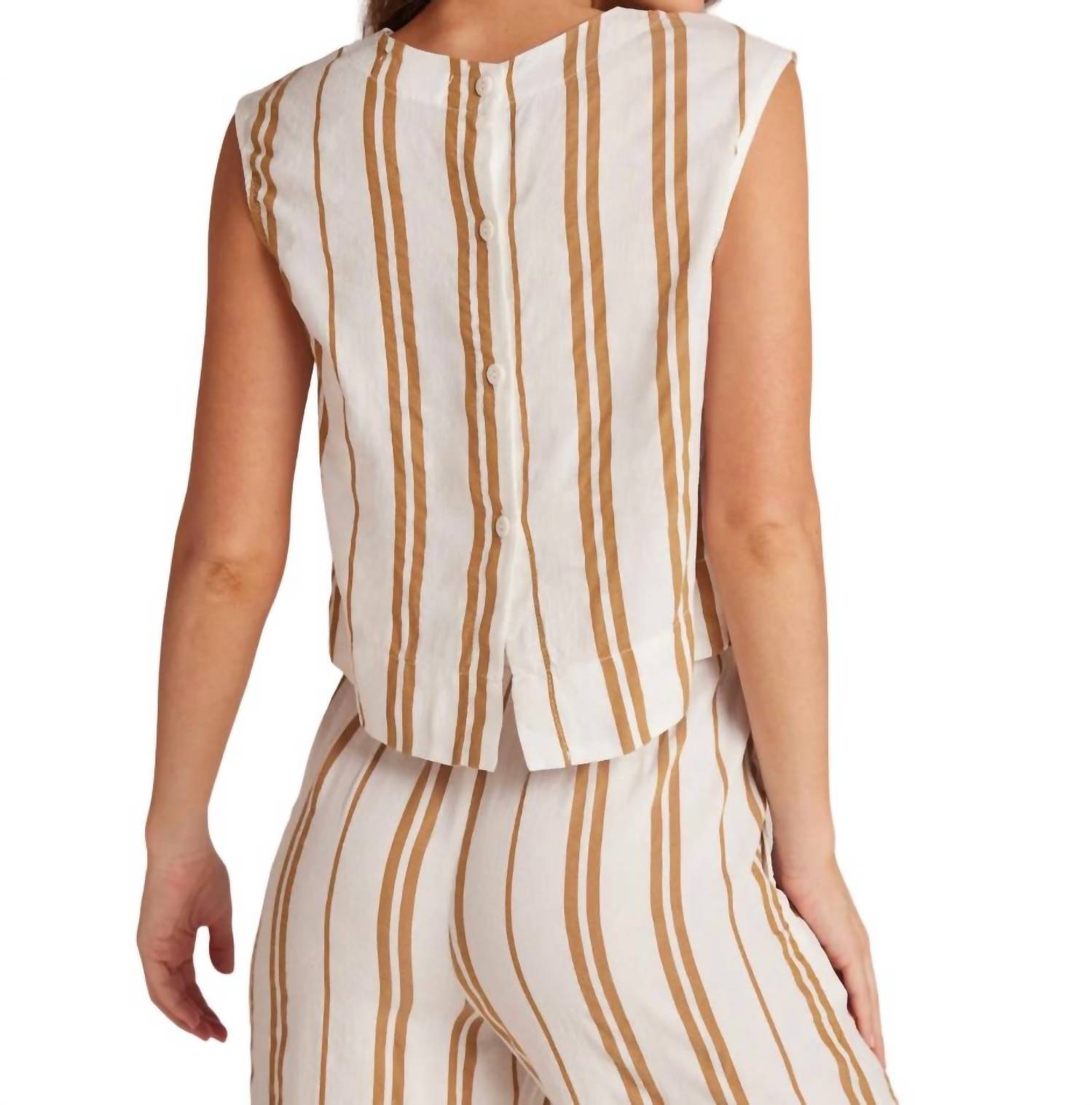 Блузка, которая никогда не выйдет из моды. Без рукавов. Застежка на пуговицы сзади. Модель ростом 5 футов 10 дюймов, на ней размер XS. Машинная стирка в холодной воде. 55% лен, 32% вискоза, 13% тенсел.
