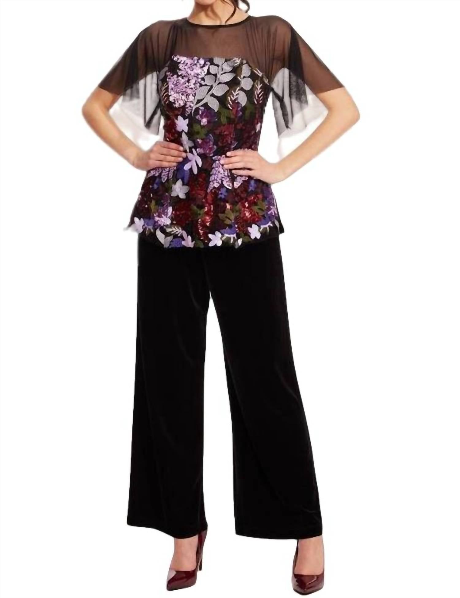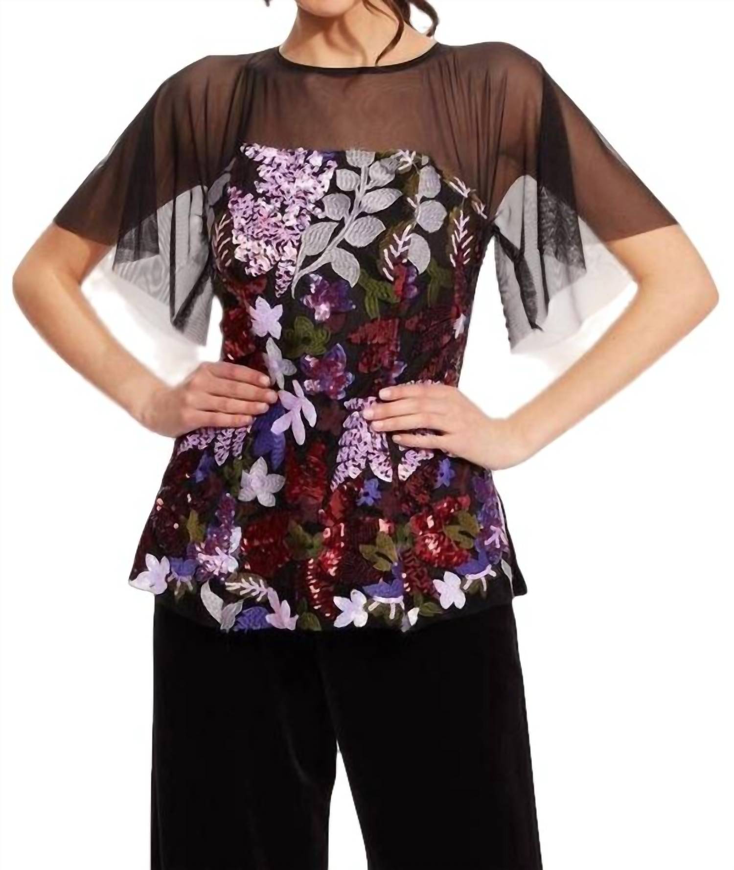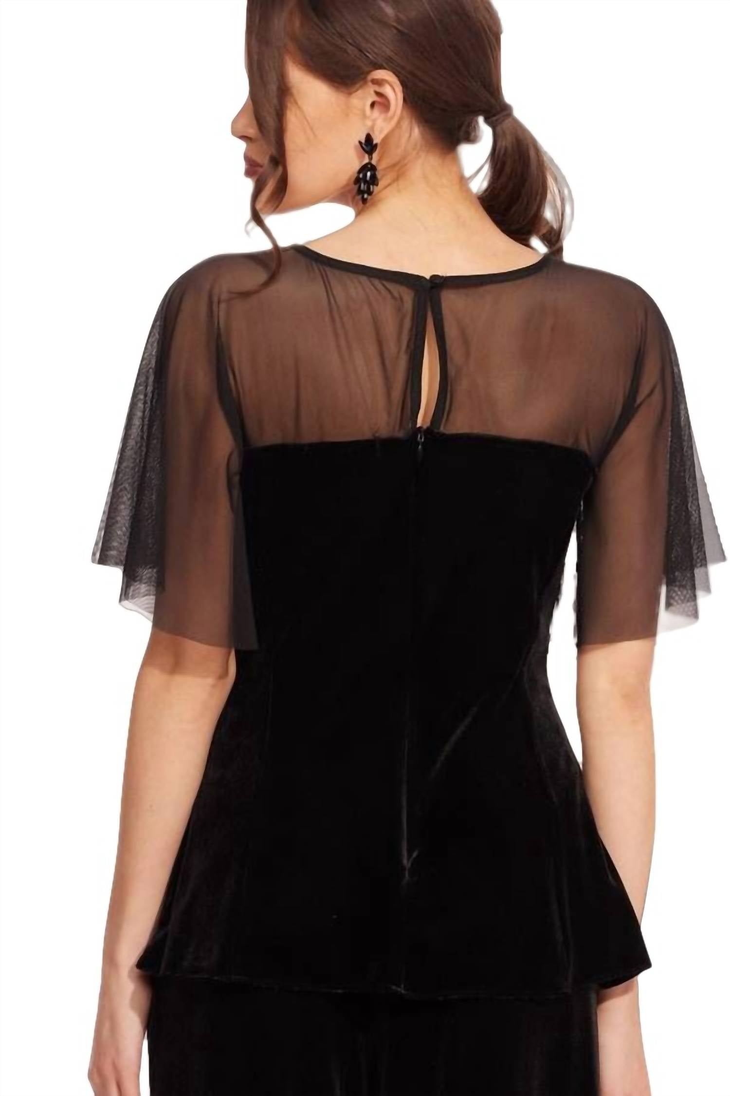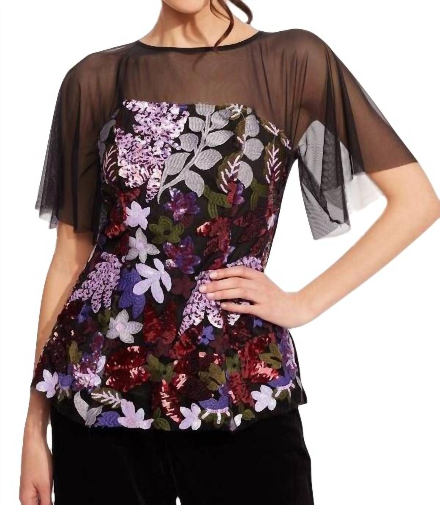 Верх Sophie — кружево, расшитое пайетками, с мягкой и воздушной прозрачной кокеткой из сетки и короткими рукавами-крылышками. Приталенный лиф с отделкой «принцесса». Застежка-молния сзади. Прозрачные черные сетчатые рукава и кокетка. Застежка на пуговицы с замочной скважиной на вырезе горловины. Полиэстер; Подкладка из полиэстера. Ручная стирка в холодной воде. Сделано в Лос-Анджелесе, США.