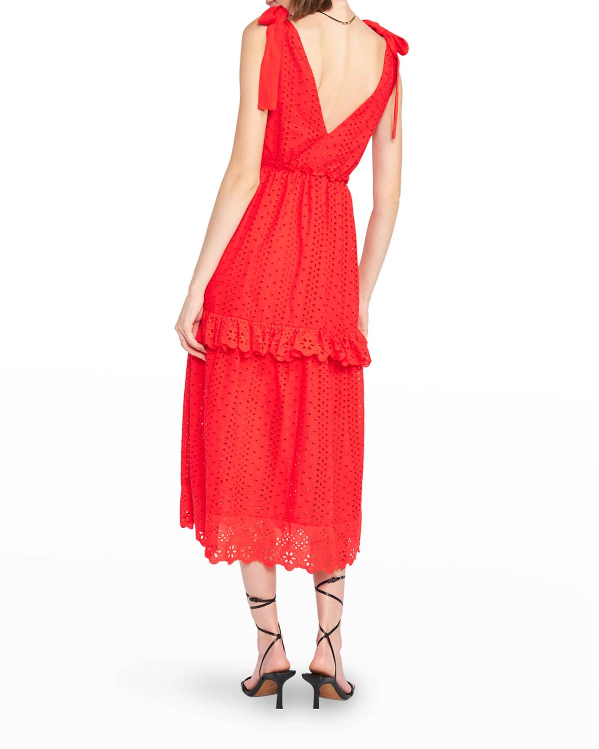 Идеальная длина платья существует. V-образный вырез. Завязывающиеся плечи. Длина миди. А-силуэт.