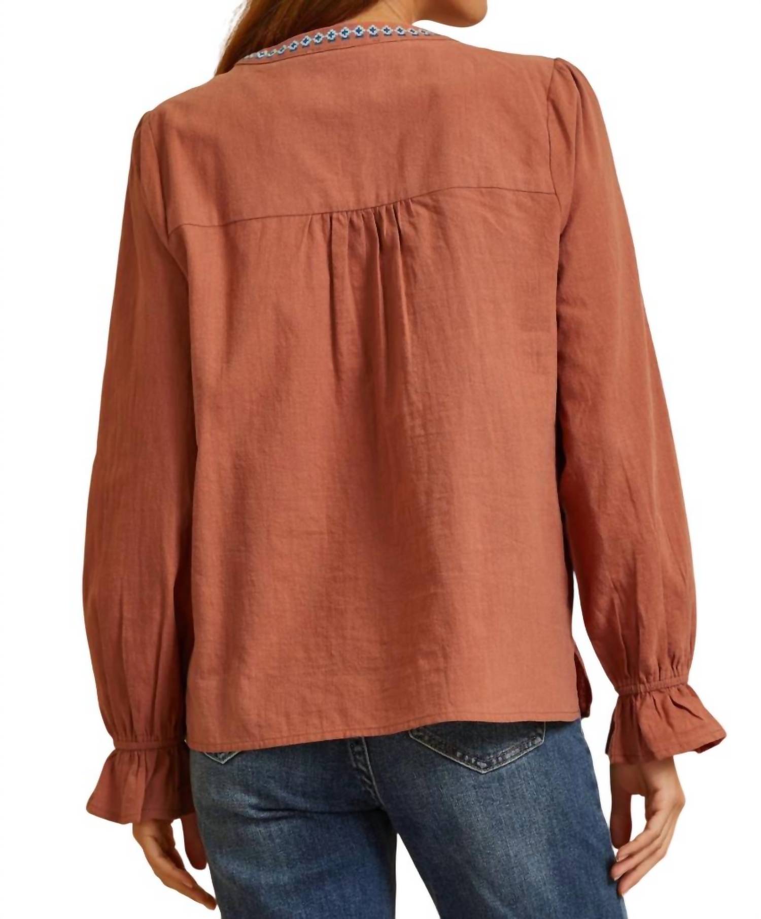 Круглый вырез горловины с четырьмя пуговицами, красочная вышивка, длинные рукава с резинкой и оборкой на запястье, боковые разрезы и свободный А-образный силуэт. Small - бюст 38", длина 25". Medium - бюст 40", длина 25". Large - бюст 42", длина 25". 1X - бюст 50", длина 27". 2X - бюст 52", длина 27". 3X - бюст 54", длина 27". 100% хлопок без эластичности. Ручная стирка в холодной воде.