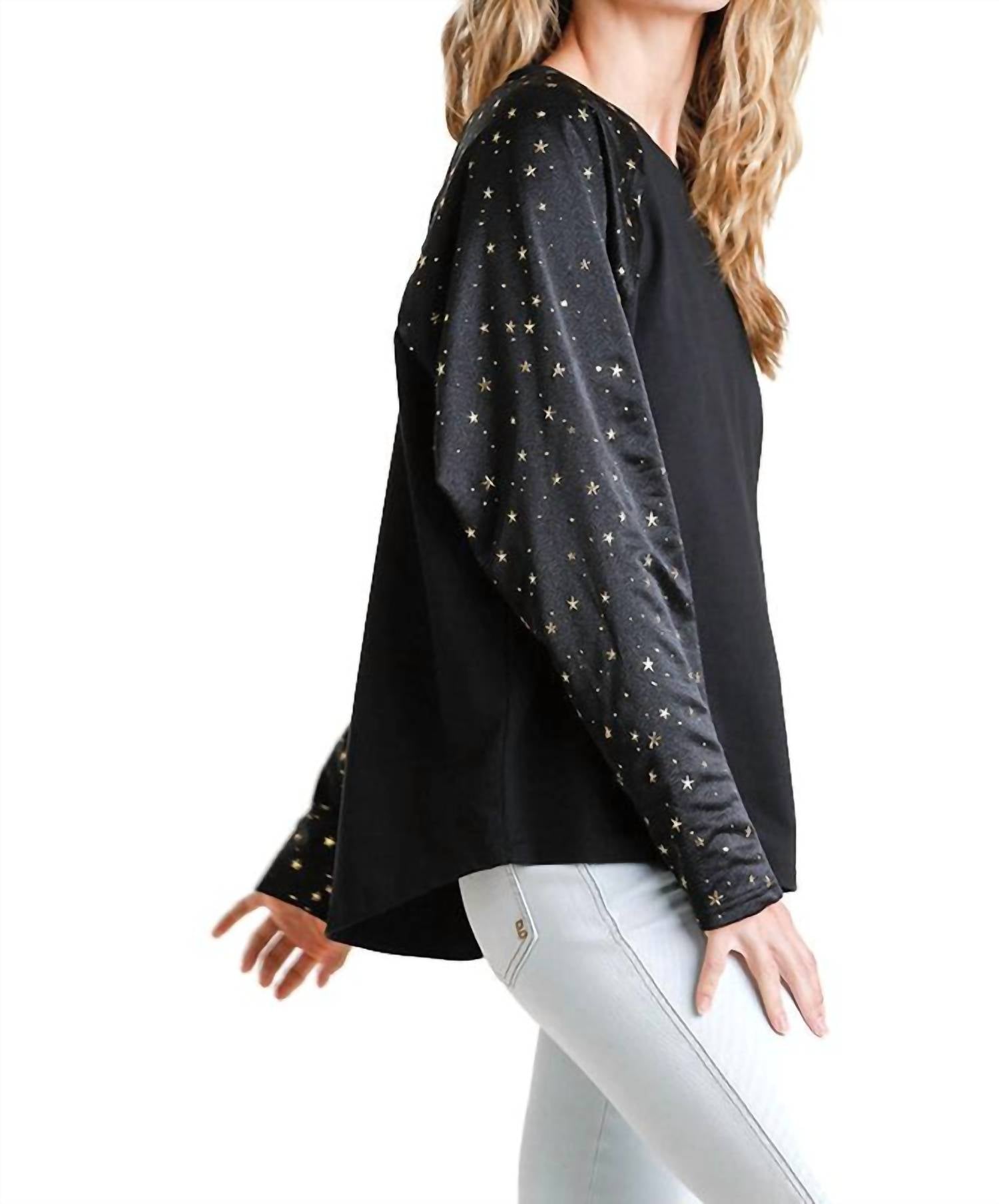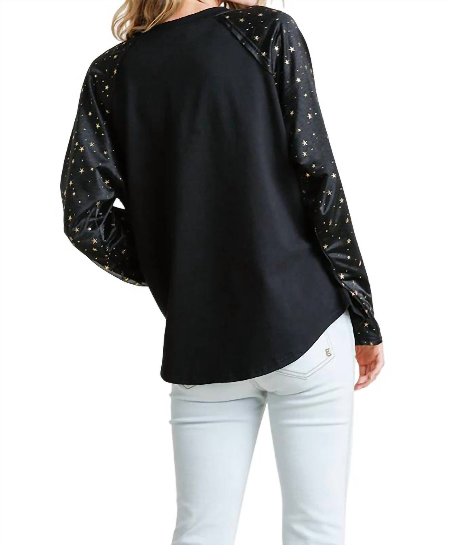 Круглый вырез, длинные сетчатые рукава реглан со звездами из золотой фольги и асимметричный подол. Маленькая грудь 44" Длина 25"; Средняя грудь 46" Длина 25"; Большая грудь 48" Длина 25"; XL Бюст 52" Длина 27"; 1X Бюст 54" Длина 27"; 2X Бюст 56" Длина 27". Спинка длиннее. Основная часть из 100% хлопка; контрастная часть из 100% полиэстера. Импортная; ручная стирка в холодной воде.