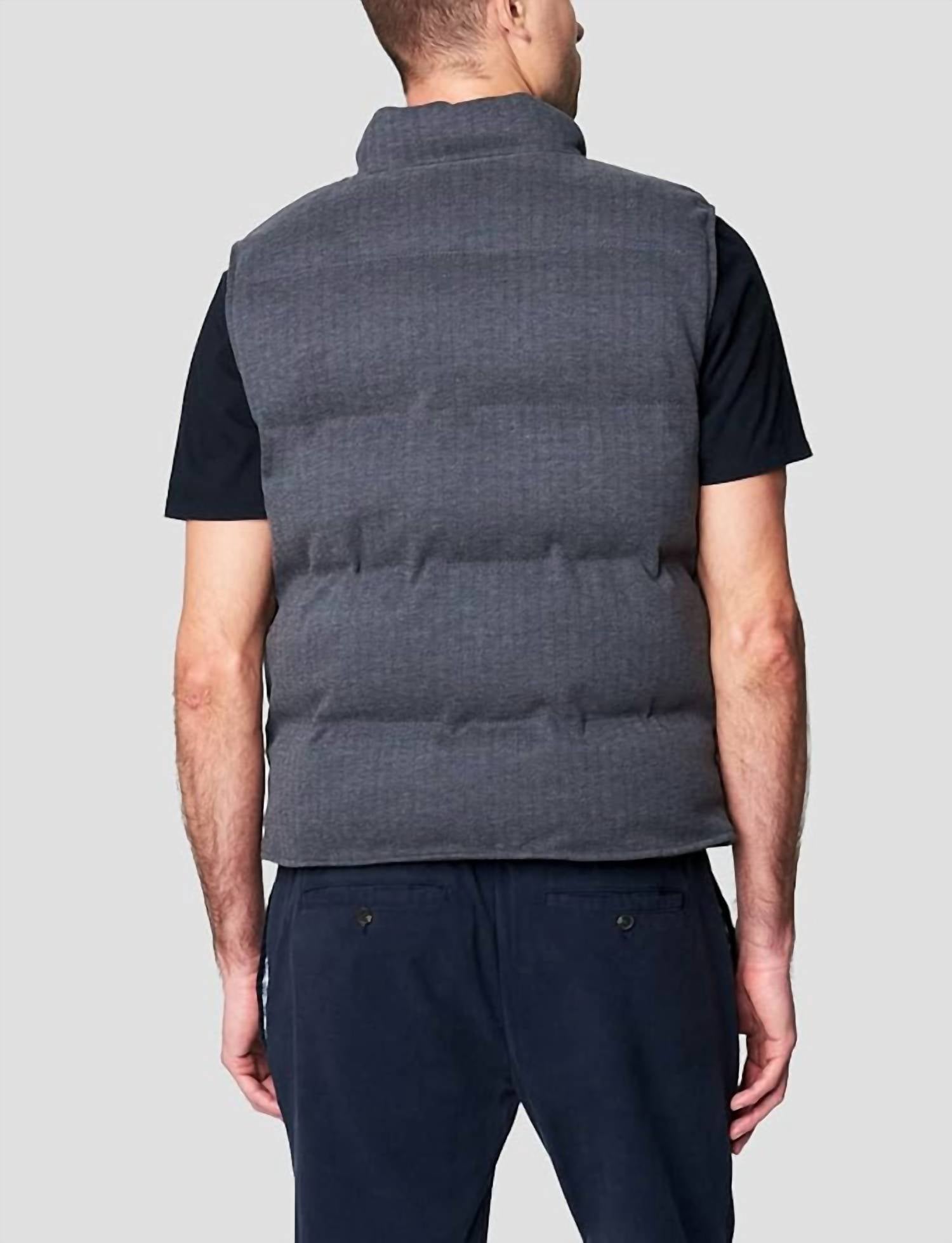 80% полиэстер, 15% вискоза. Мужской стеганый пуховик серого цвета. Застежка-молния спереди с кнопками. Карманы, высокий воротник. Жилет средней или тяжелой плотности!